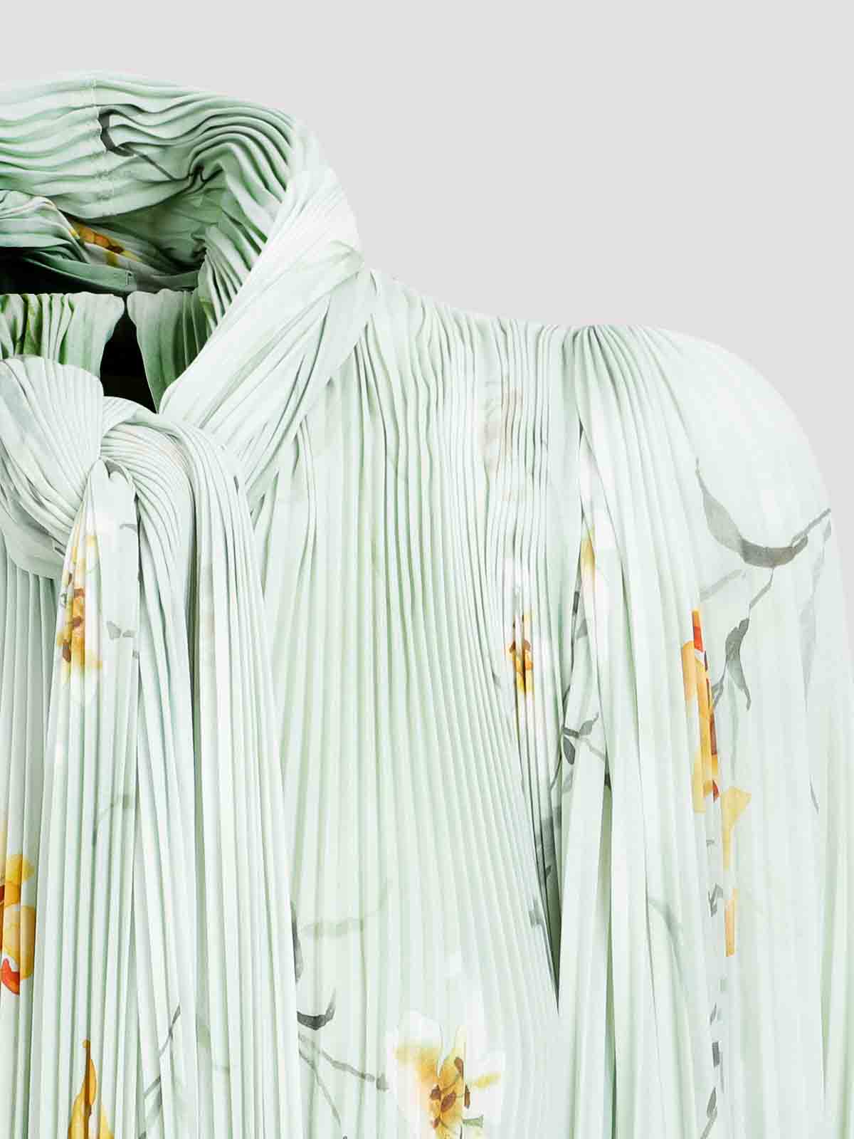 Balenciaga green polyester blouse. crafted in green pleated fabric, flowers pattern all over, cloak design inspired, padded shoulders, crew neckline with self-tie closure, irregular hem.