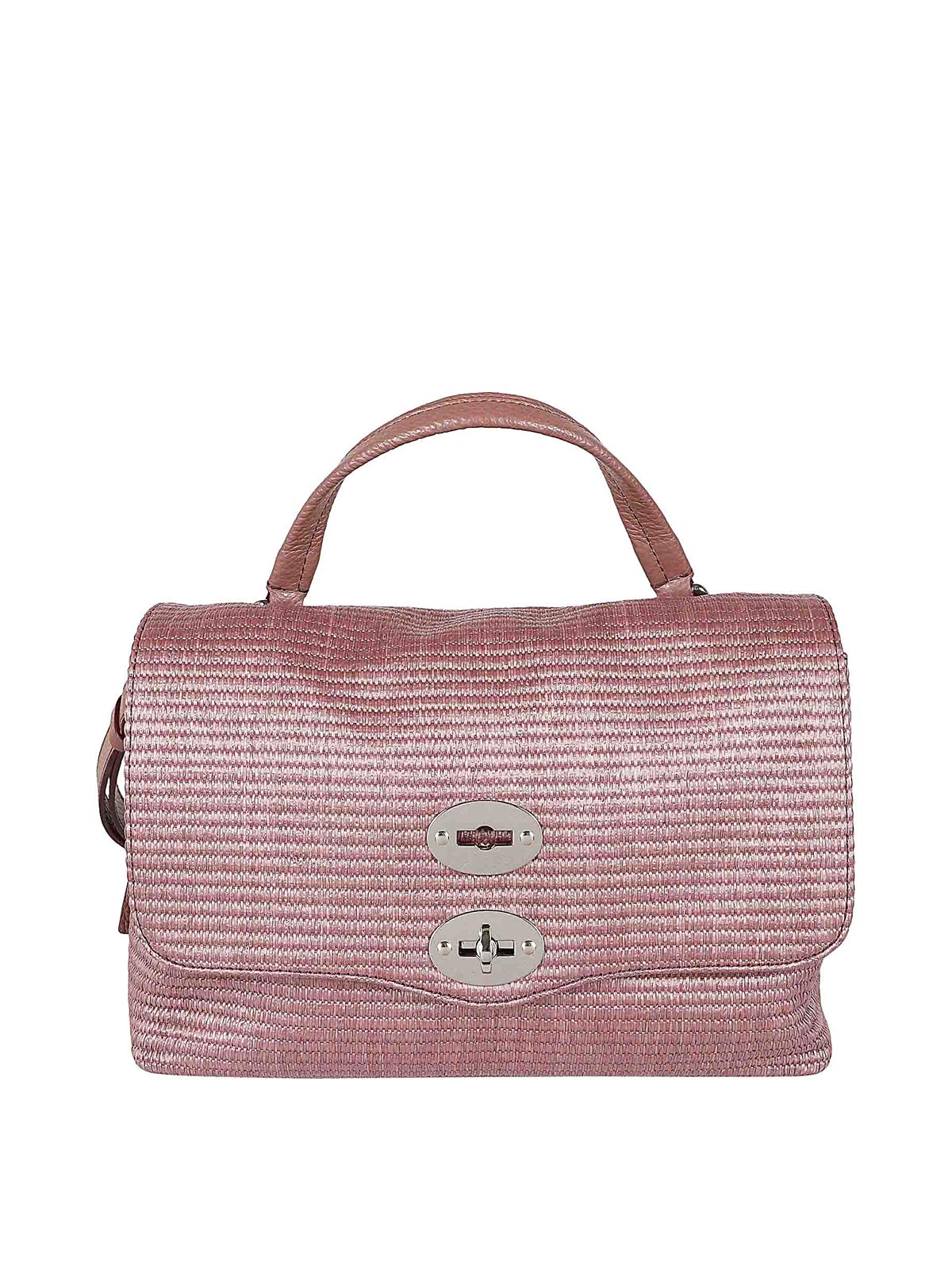 Bag in violet woven raffia, front flap with twist lock, metal parts, two compartments, one zip pocket and one open pocket