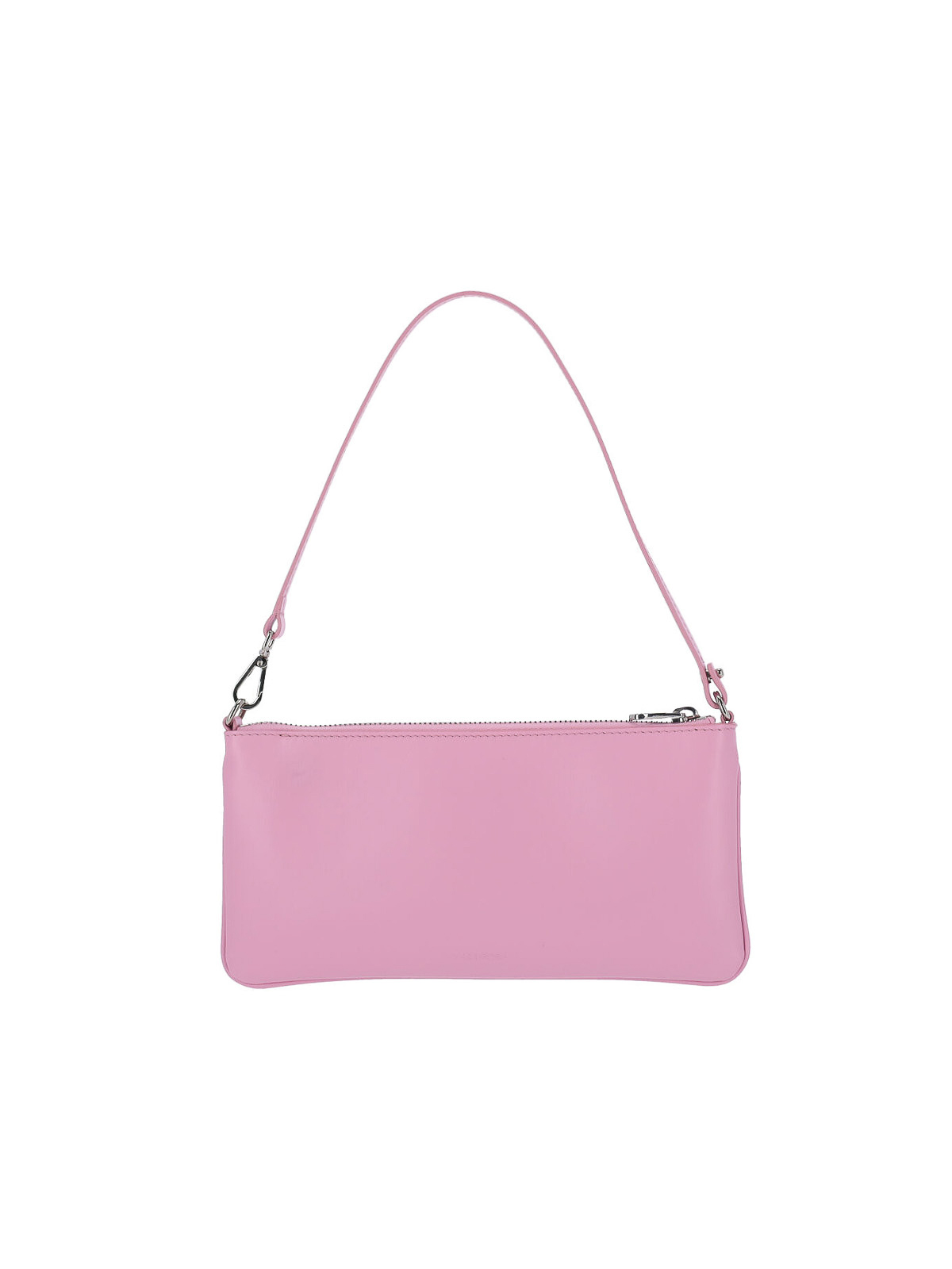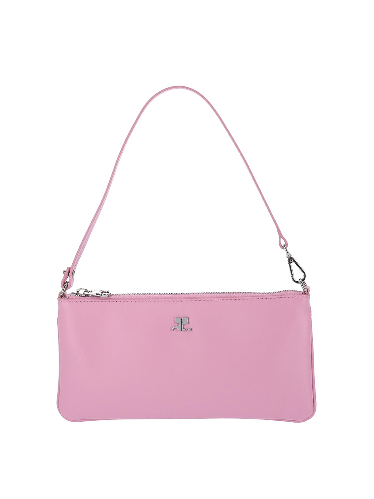 Courreges logo pouch in pink calfskin, one adjustable top handle, top zip closure, front silver metal logo, one internal compartment.