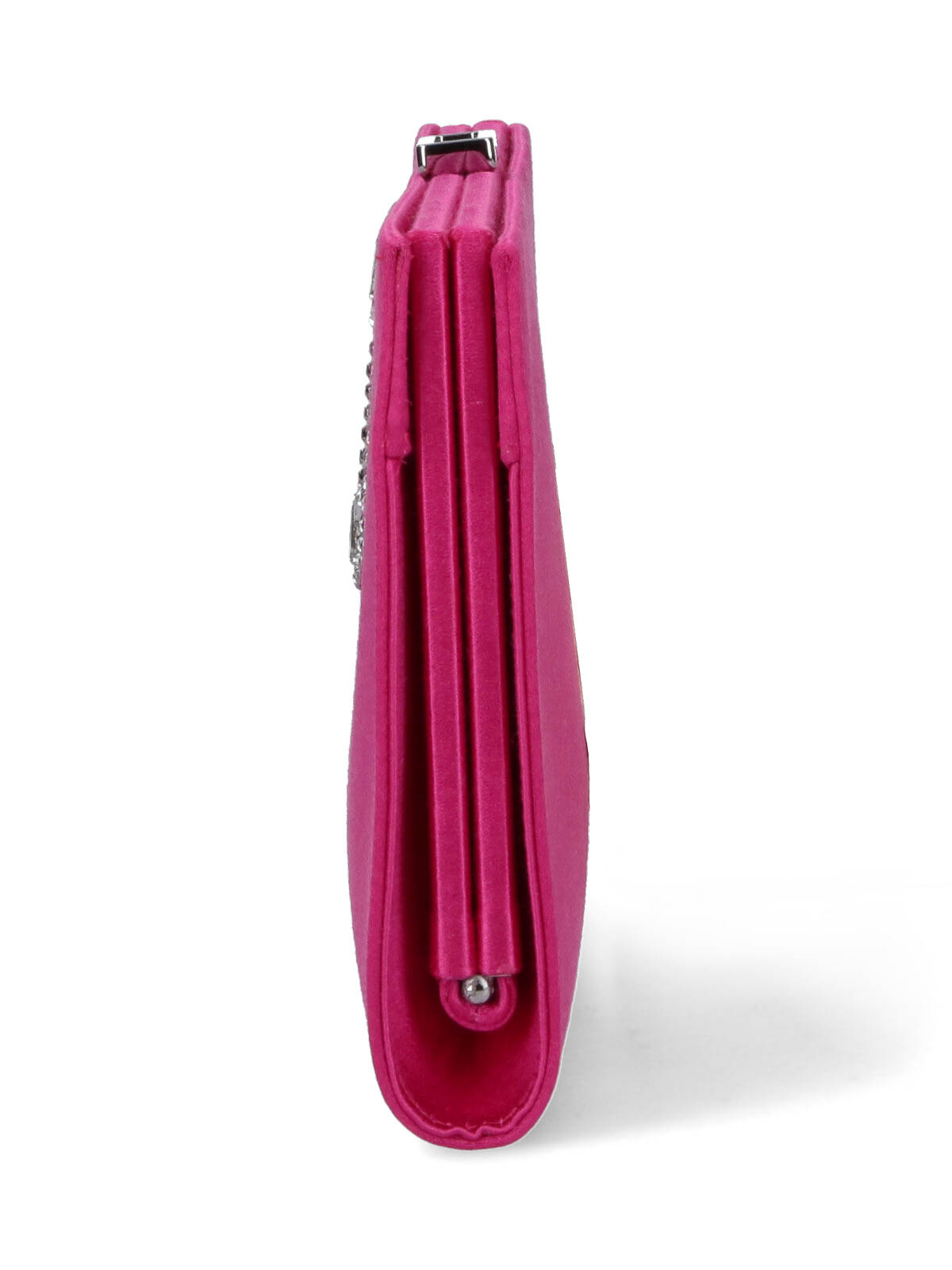 Roger Vivier pilgrim pouch in pink fabric, metal snap closure, baguette crystals on front, silk satin lining, one main internal compartment.