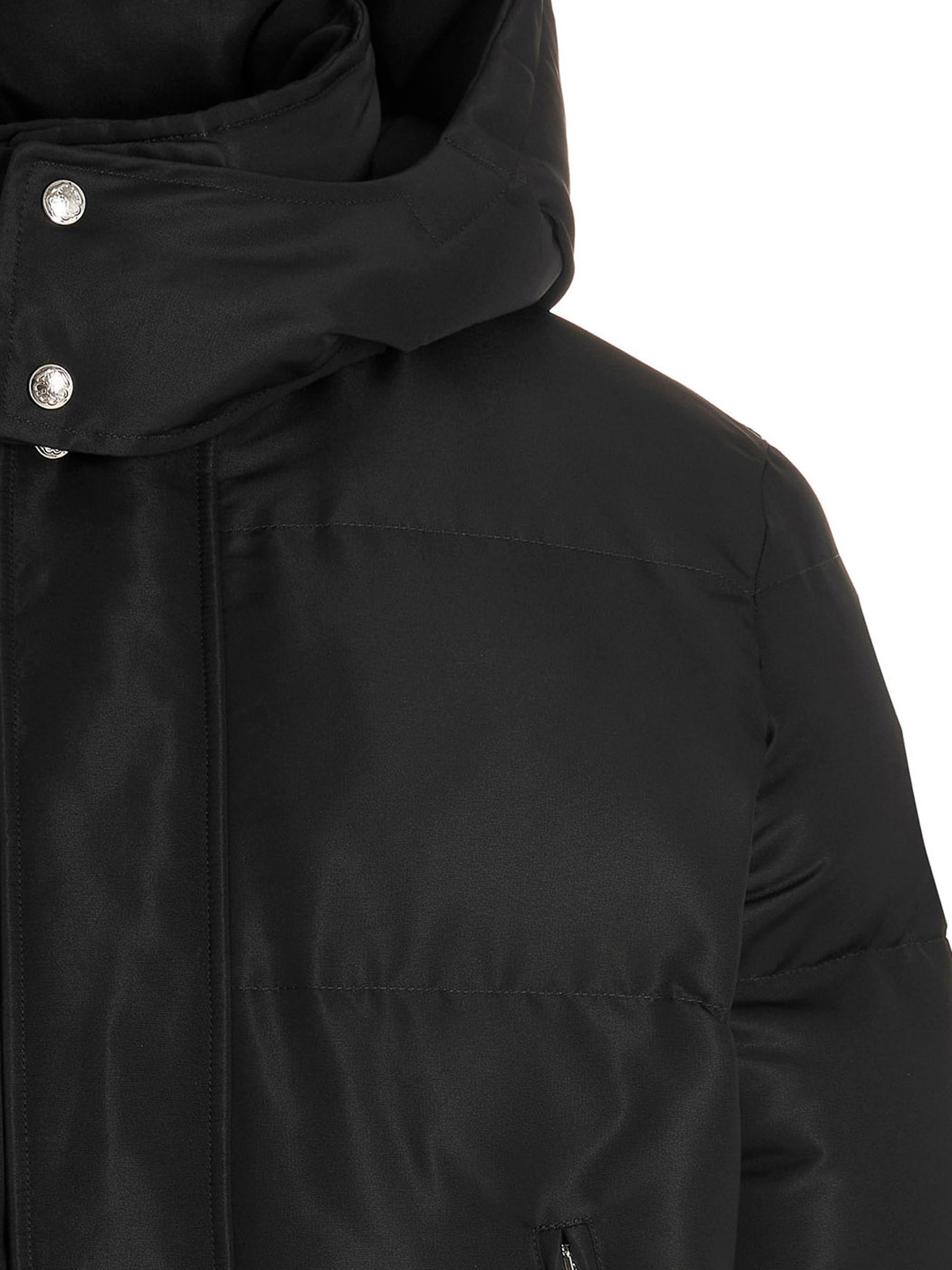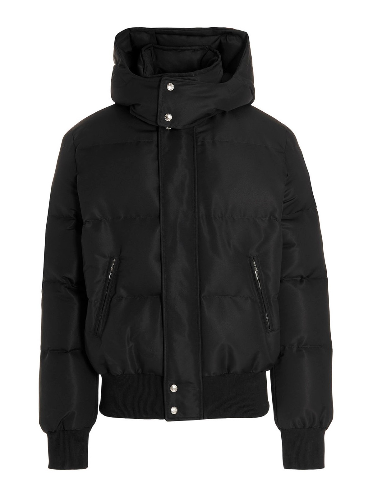 Down jacket with removable hood, tonal print on the back, button closure, pockets and long cuffed sleeves.
