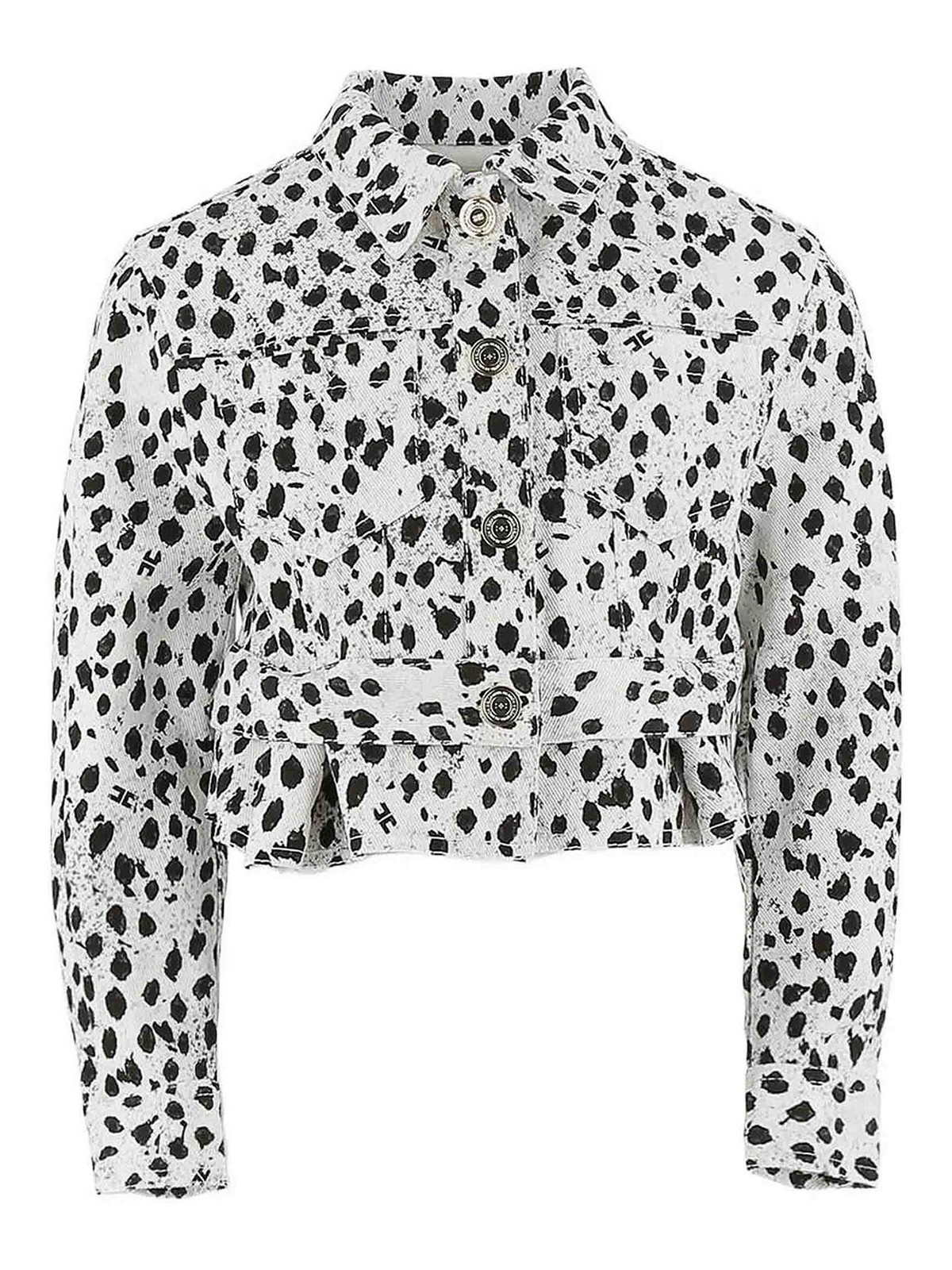 White/black spot print button closure ruffled hem long sleeves crop design fabric
