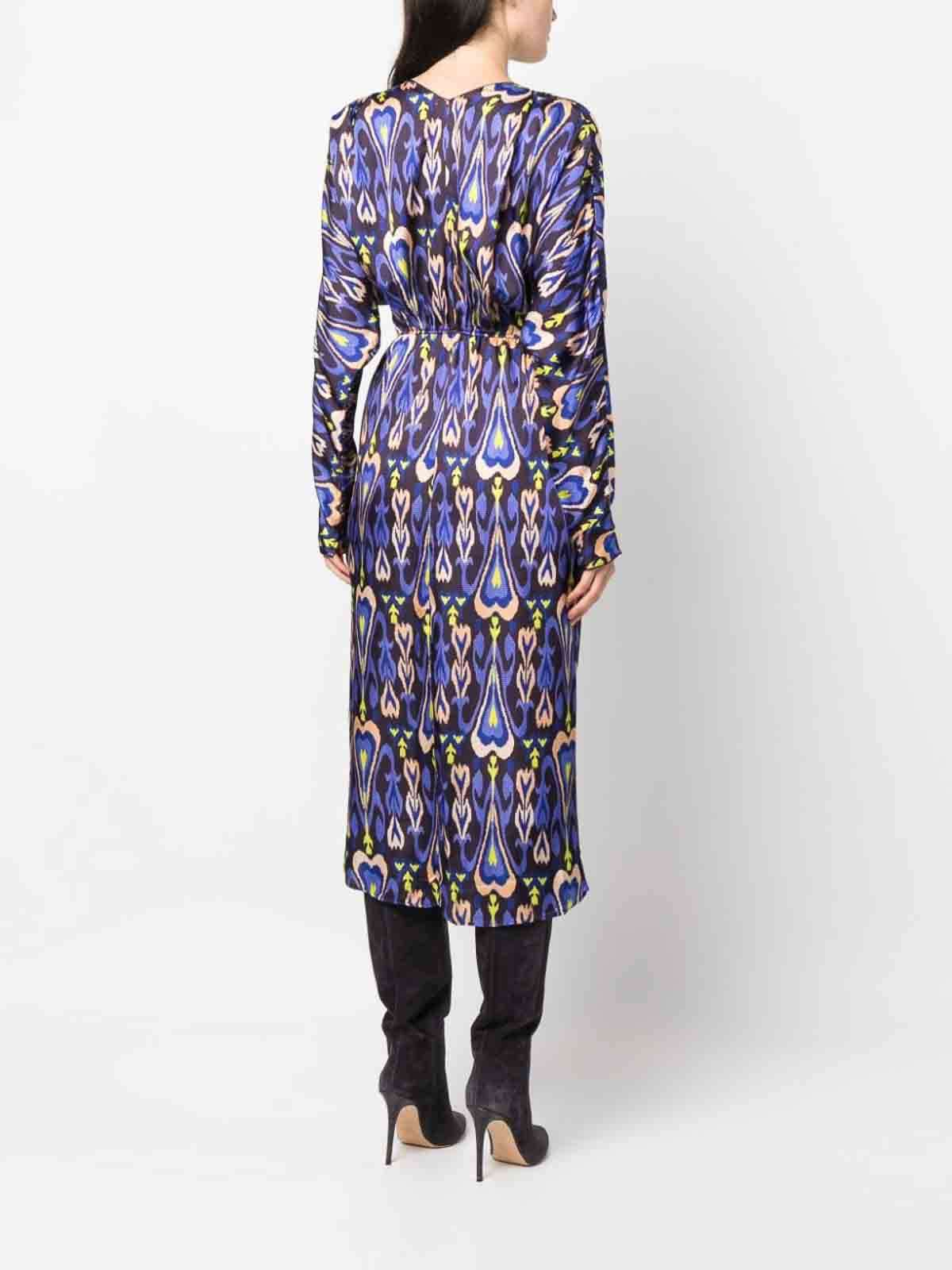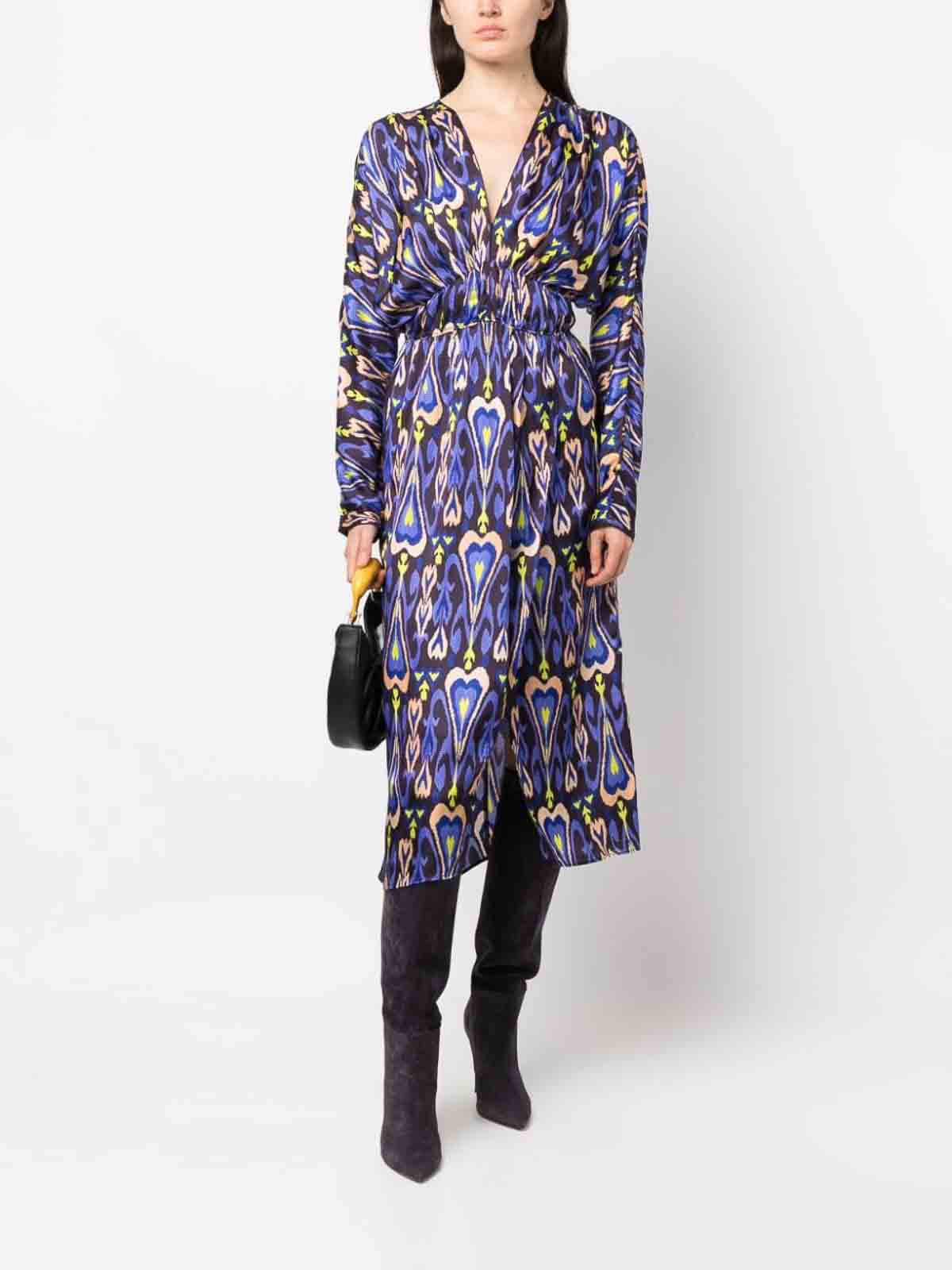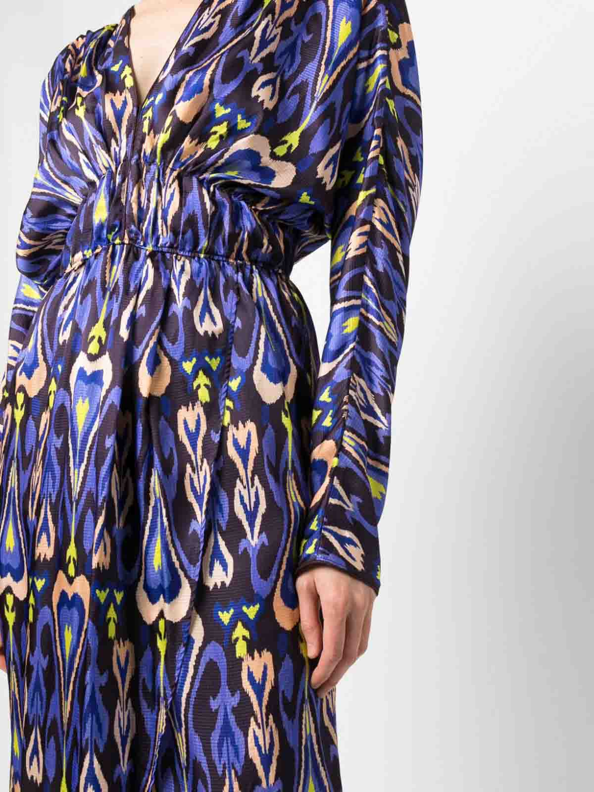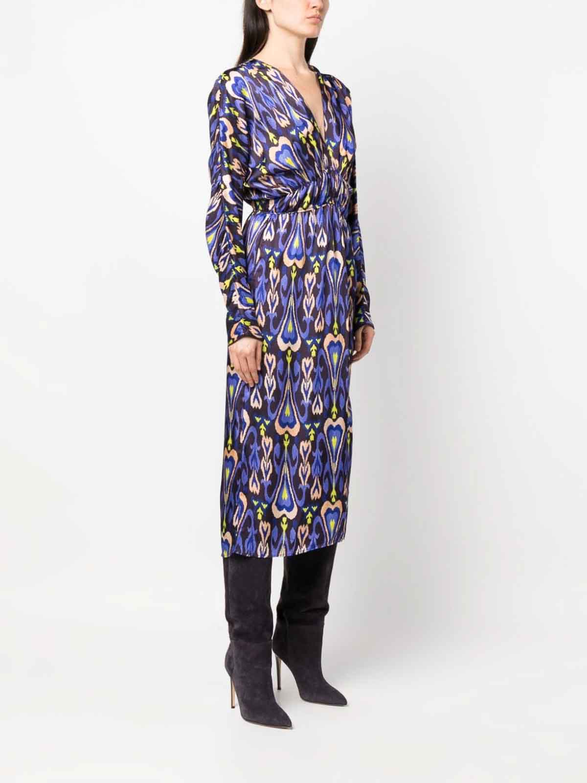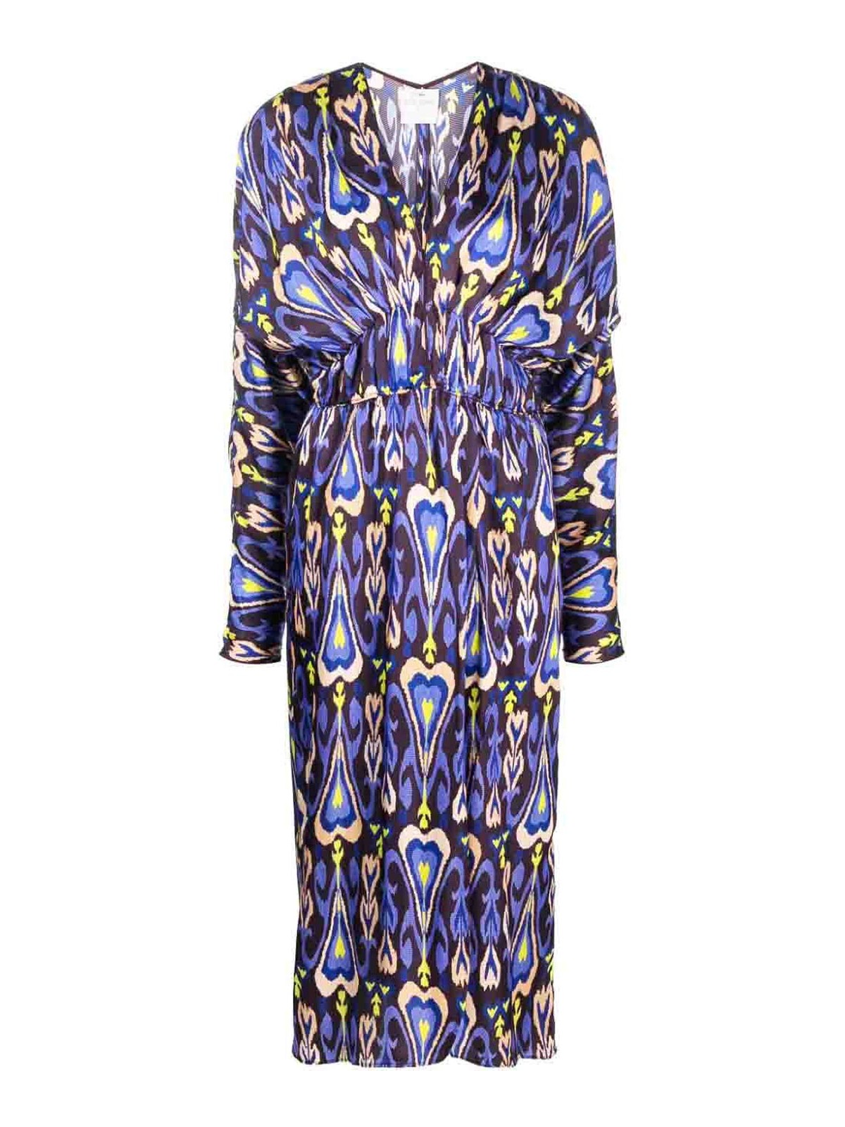 Graphic-pattern v-neck midi dress from forte forte featuring all-over graphic print piped-trim detailing v-neck royal blue multicolour finish long sleeves and mid-length