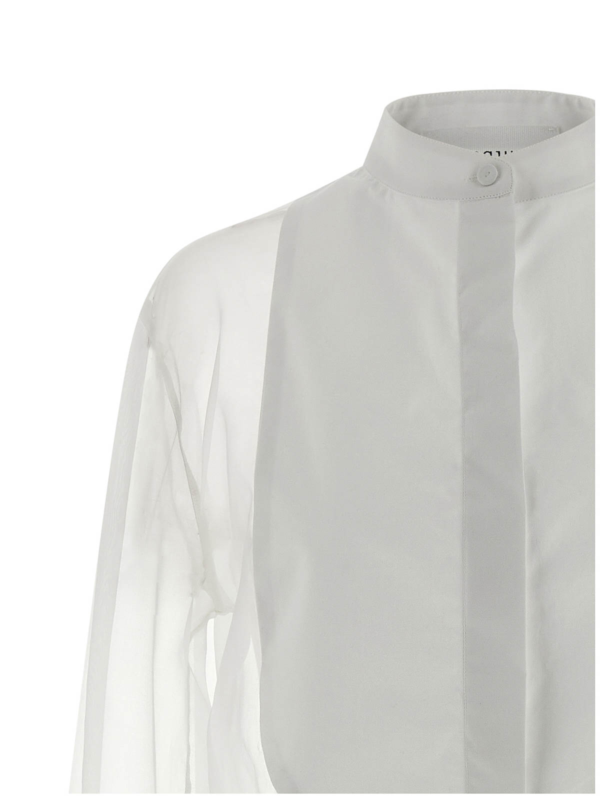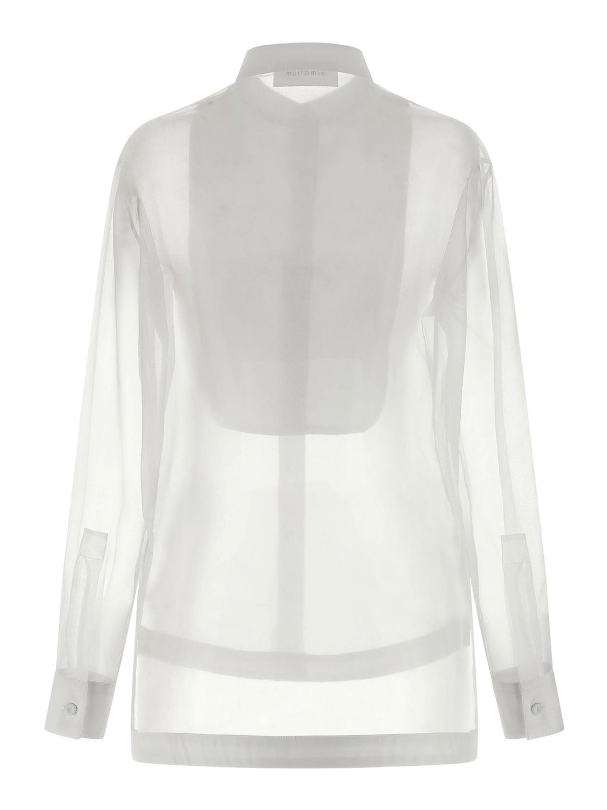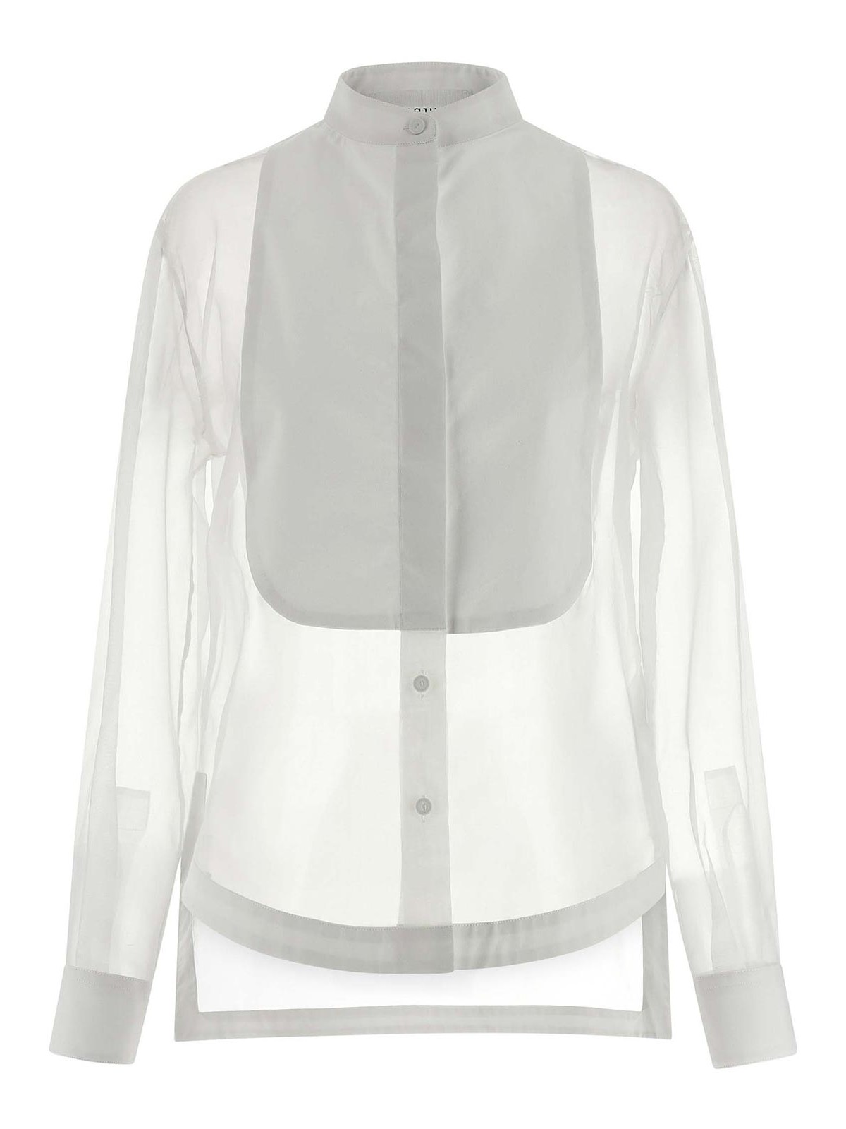 prisca' semi-transparent silk organza shirt, tuxedo model, double plastron in cotton poplin, mandarin collar, front button closure, long cuffed sleeves, asymmetric hem, side slits.