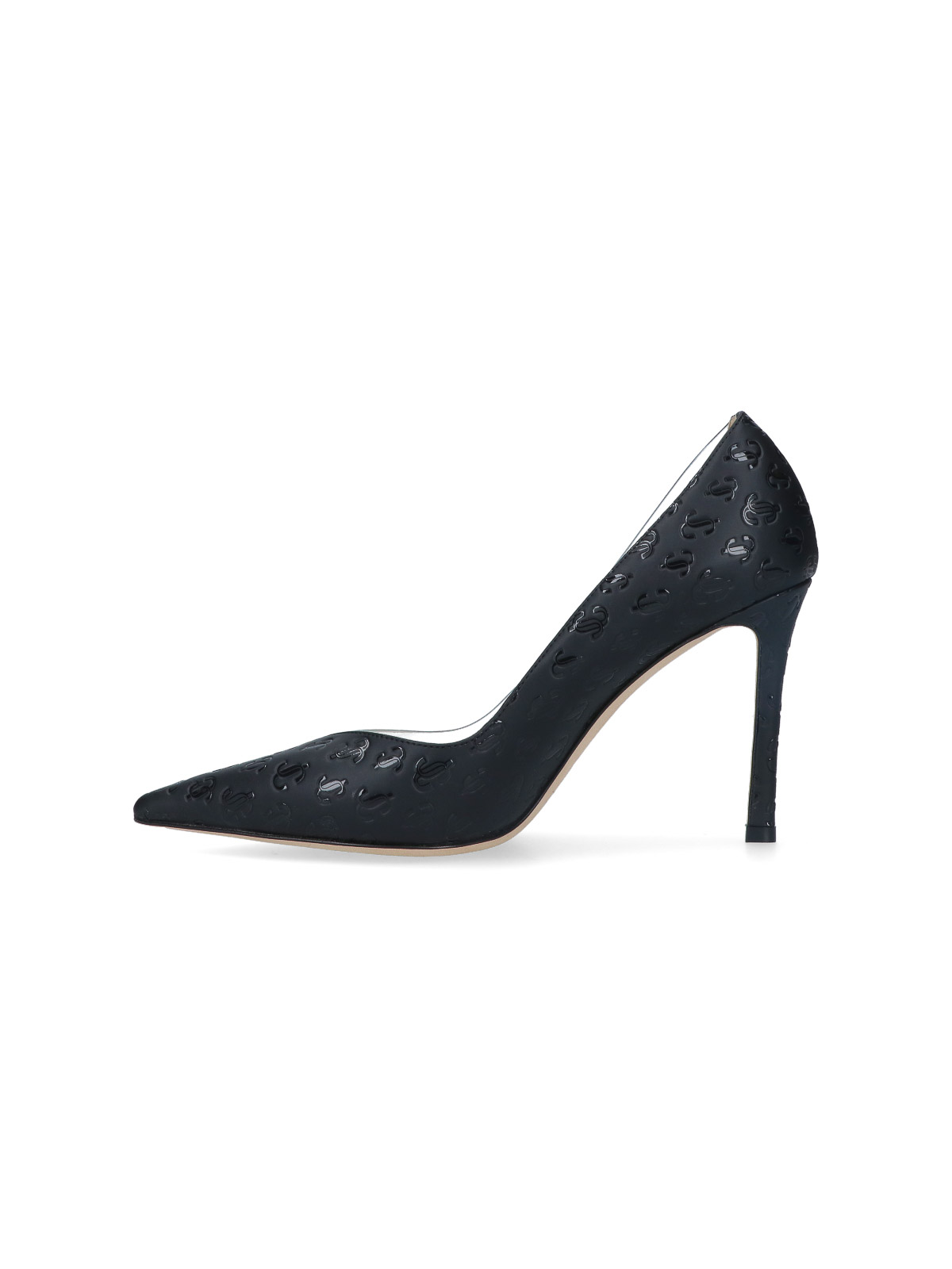 Black jimmy choo cass pump with all-over logo print, pointy transparent plexiglass panels, slip-on fit with leather stiletto