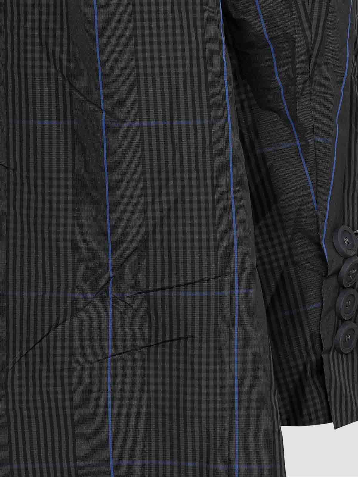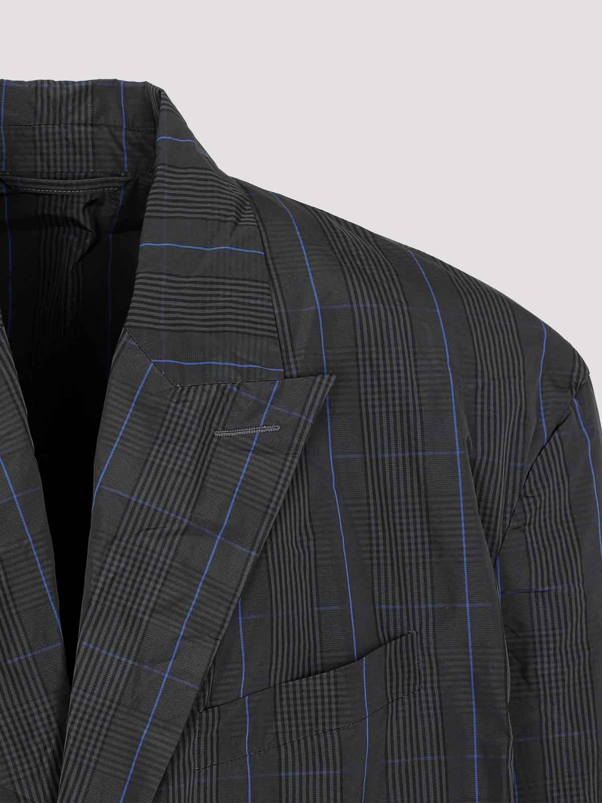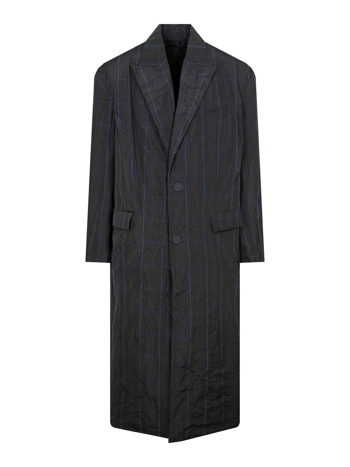 Balenciaga gray chechered long raincoat. gray nylon with checkered pattern all over, long sleeves, peak lapel, front button fastening, side pockets, small chest pocket, buttoned cuffs, fully lined.