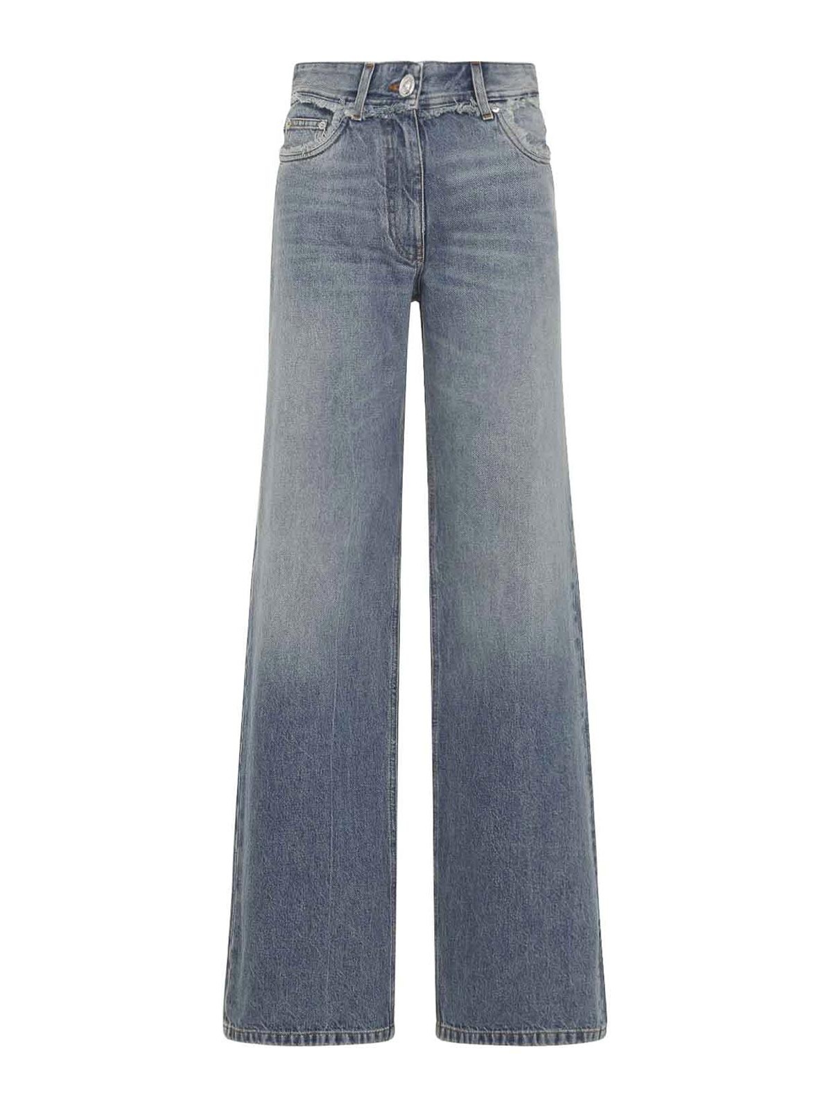 Versace raw cut medium blue cotton jeans. 5-pocket jeans crafted from bleached medium blue cotton denim, it features raw cut detailing, belt loops, front button and zip fly fastening, a branded label at the back of the waist, and a wide leg.