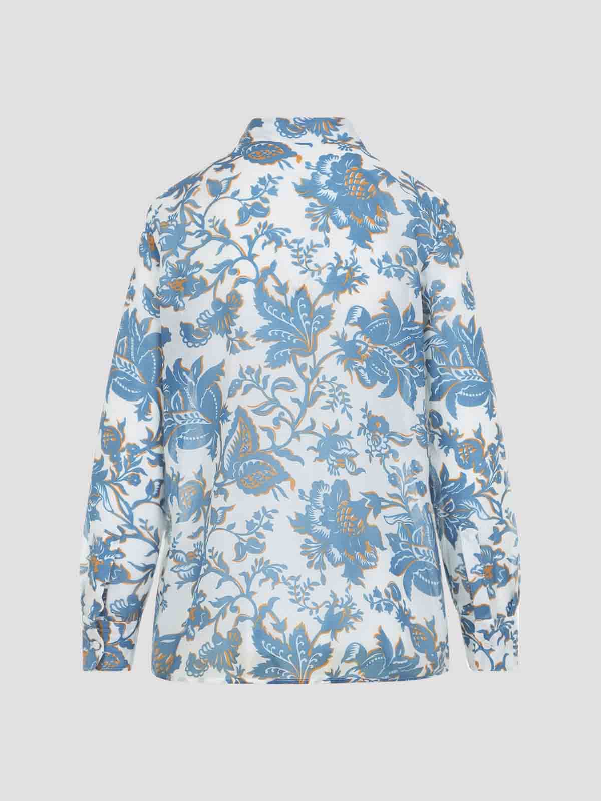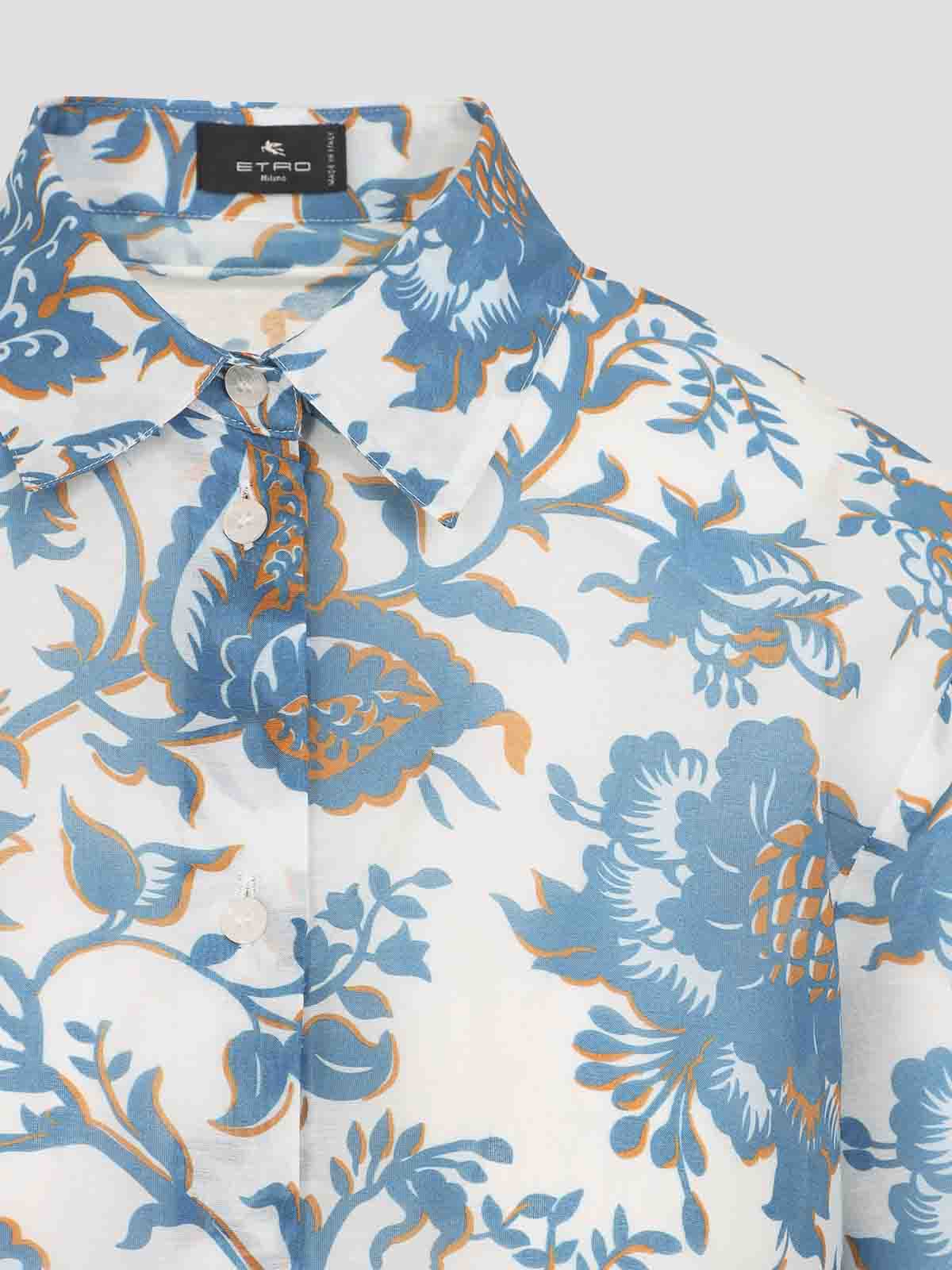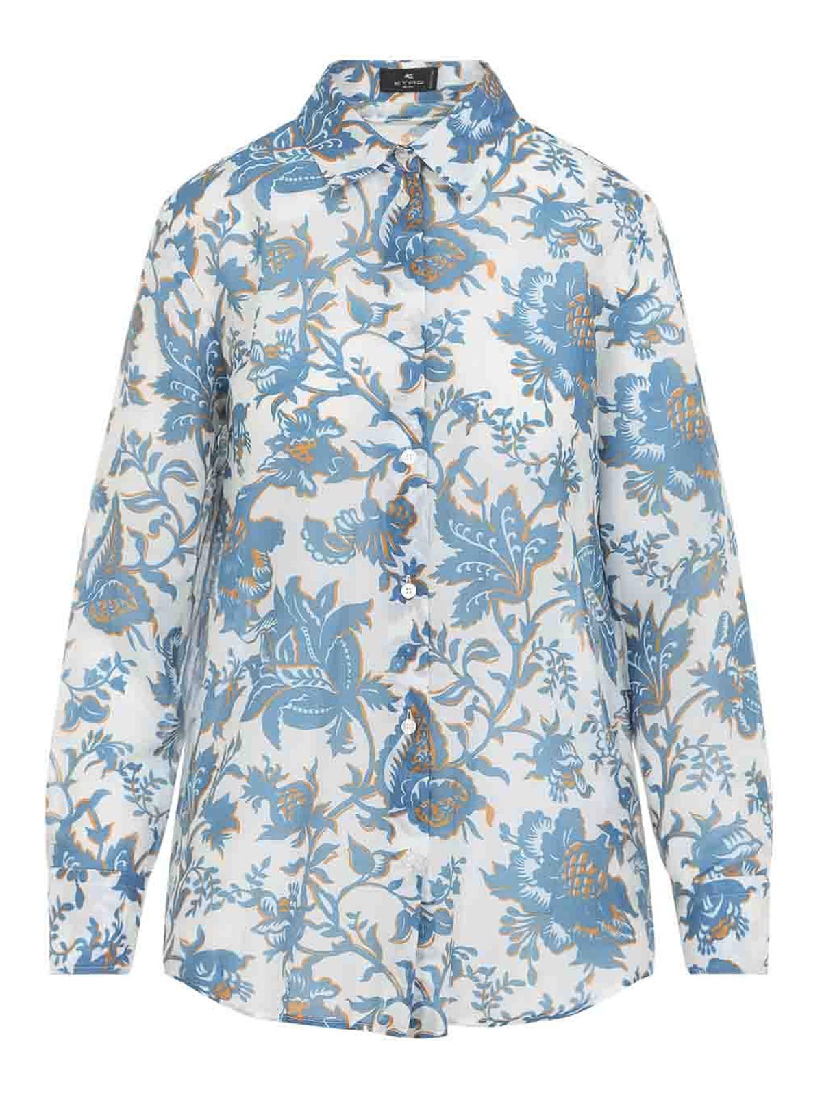 Etro regular blue cotton and silk shirt. crafted from white and blue cotton and silk blend with a signature floral motif all over, it features a pointed collar, front button fastening, long sleeves with double-buttoned working cuffs, slightly rounded hem, regular fit.