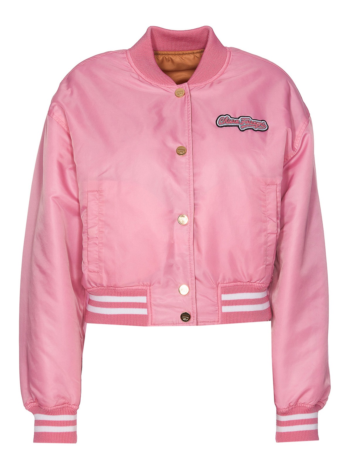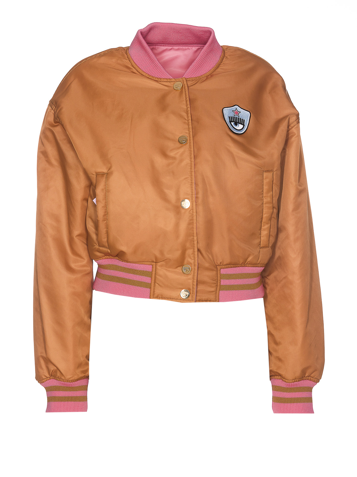 Chiara ferragni beige and fuchisa reversible jacket frontal buttons closure crewneck frontal patch eye logo lateral pockets with button closure elasticized on cuffs