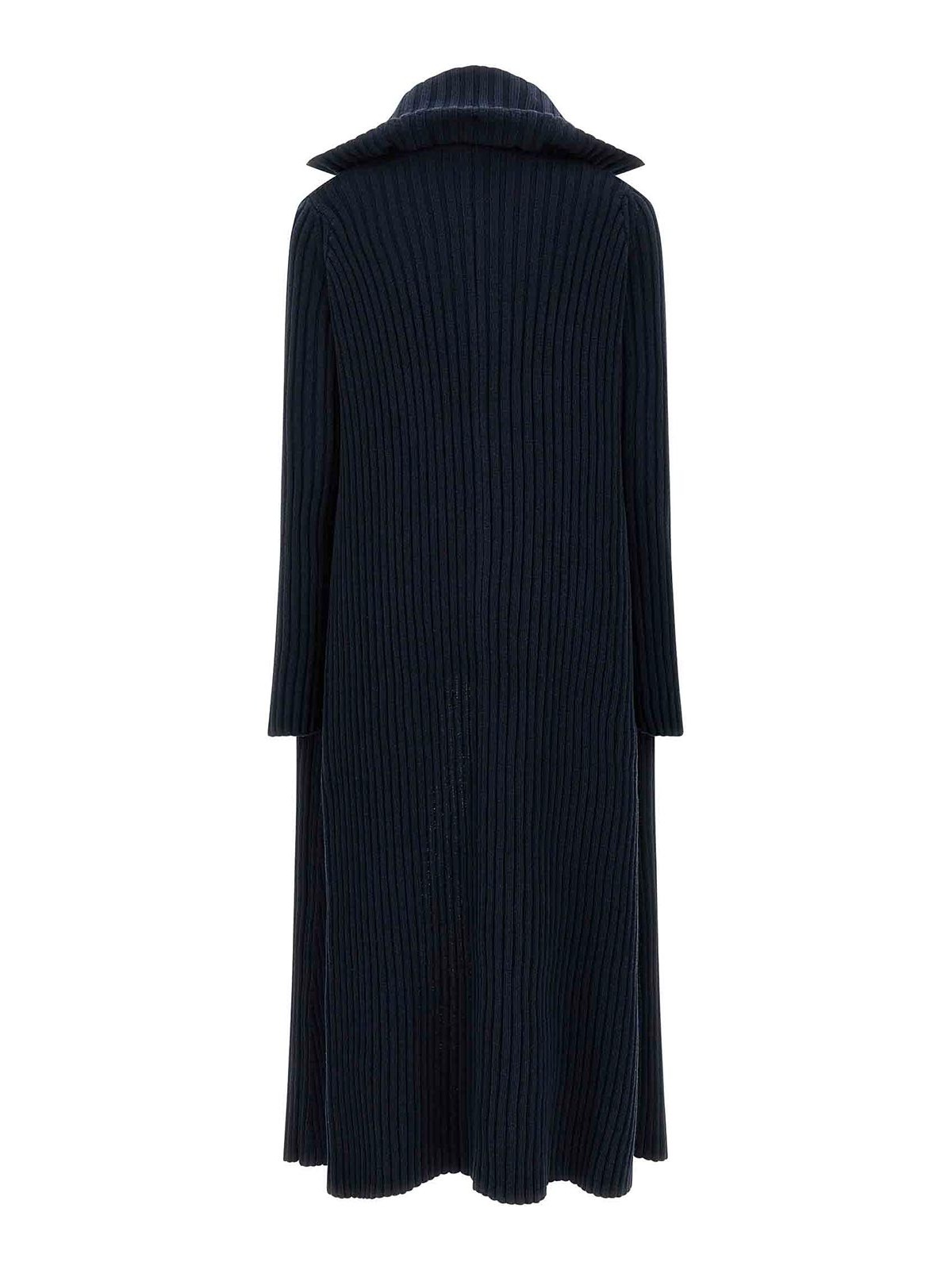 Maxi cardigan in ribbed cotton blend, shawl collar on the shoulders, dressing gown style, pockets, long sleeves.