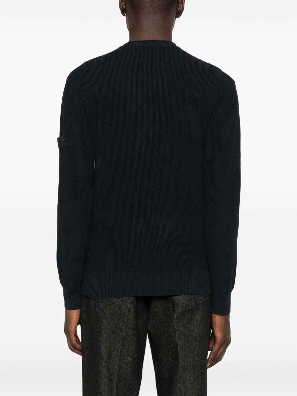 Features blue ribbed knit design crew neck long sleeves patch on