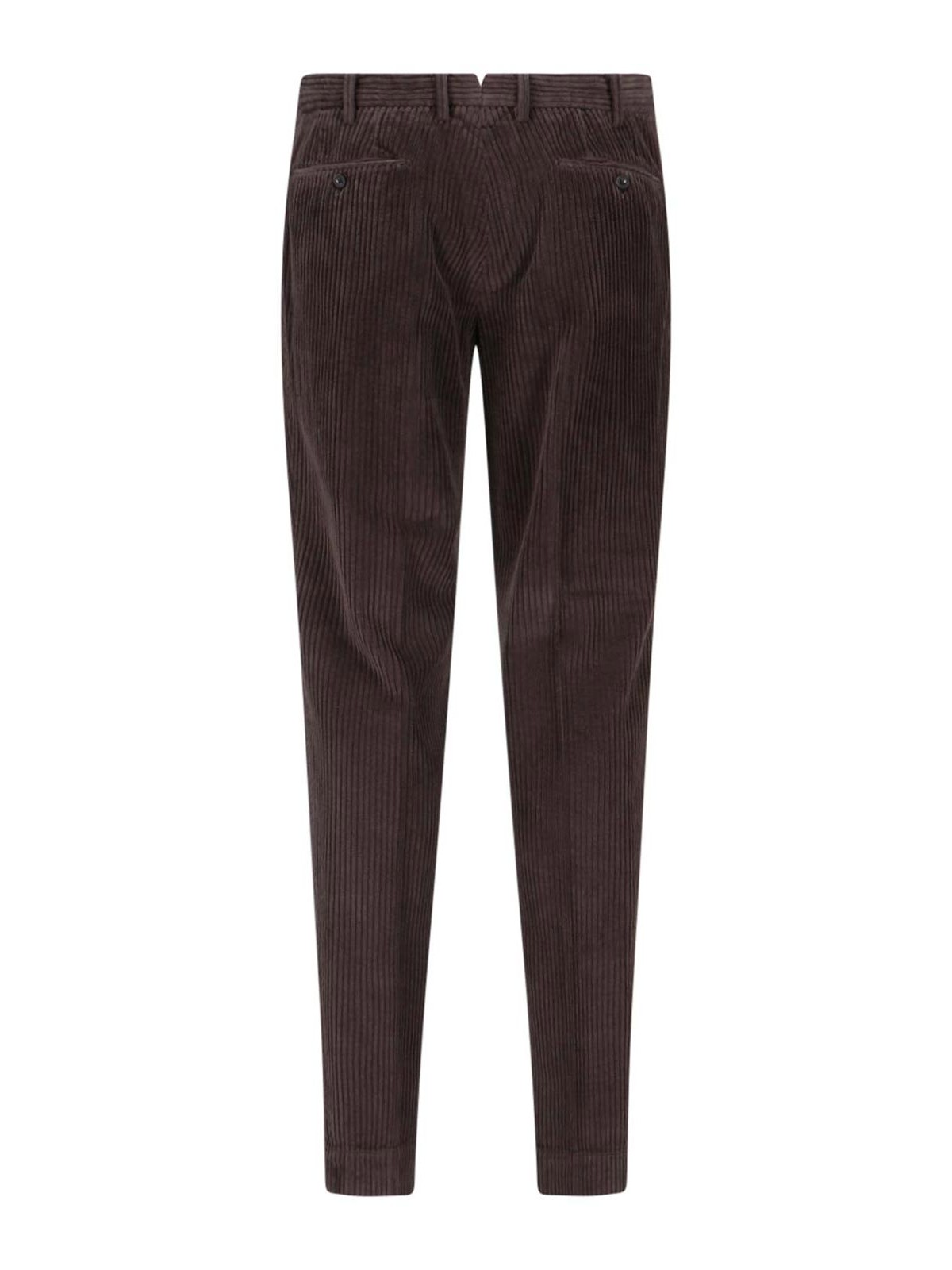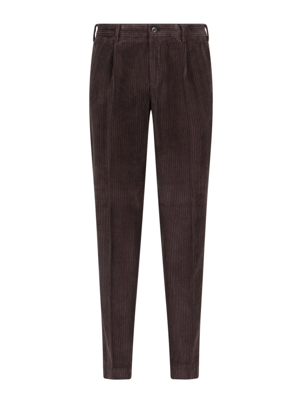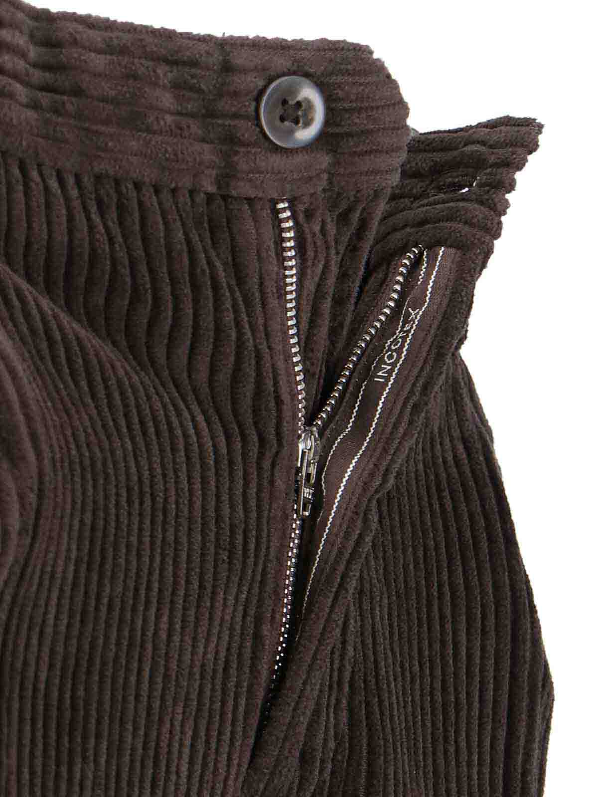 Brown incotex ribbed trousers, ribbed construction, zip and button, two side welt pockets, two rear welt pockets with buttons, front pleats
