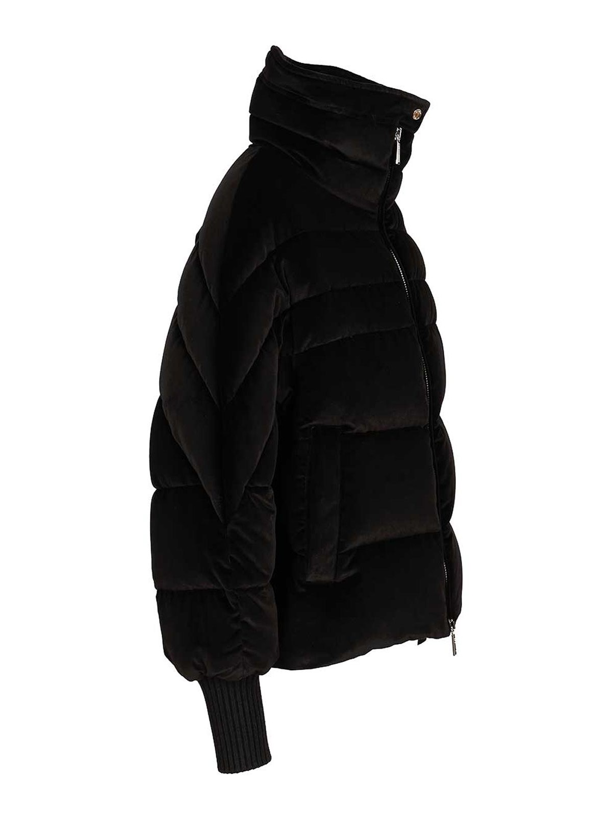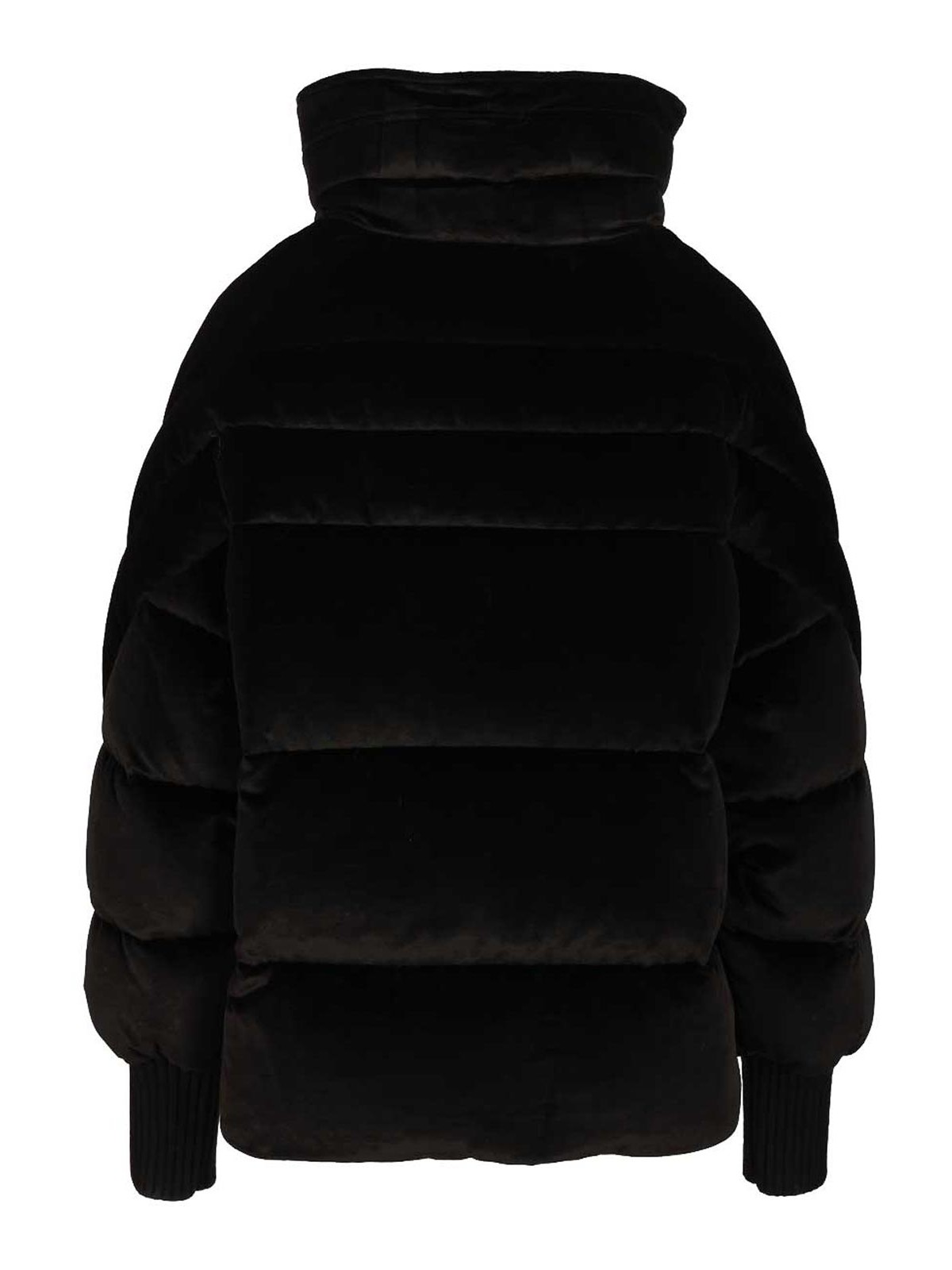 ripoli down jacket by moorer, made of iridescent microfibre, padded with the finest goose down and quilted with boudin in different sizes, maxi high collar, boudin quilting finished with stitched edge and bright logo snap button, front closure with bright double slider zip, side welt pockets closed with hidden snap button, cuffs in virgin wool knit, internal drawstring at the bottom, which transforms the garment into a dynamic bomber jacket.