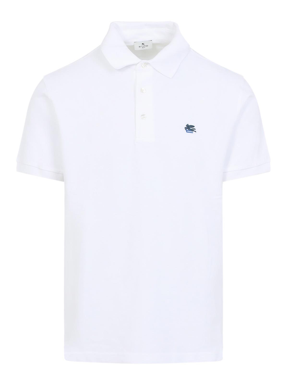 Etro roma plain white cotton polo. crafted from white cotton pique, it features a classic polo collar, a front placket with a three-button fastening, the etro logo and pegaso symbol embroidered on the chest, short sleeves with fine ribbed cuffs, a straight hem, and a signature roma regular fit.