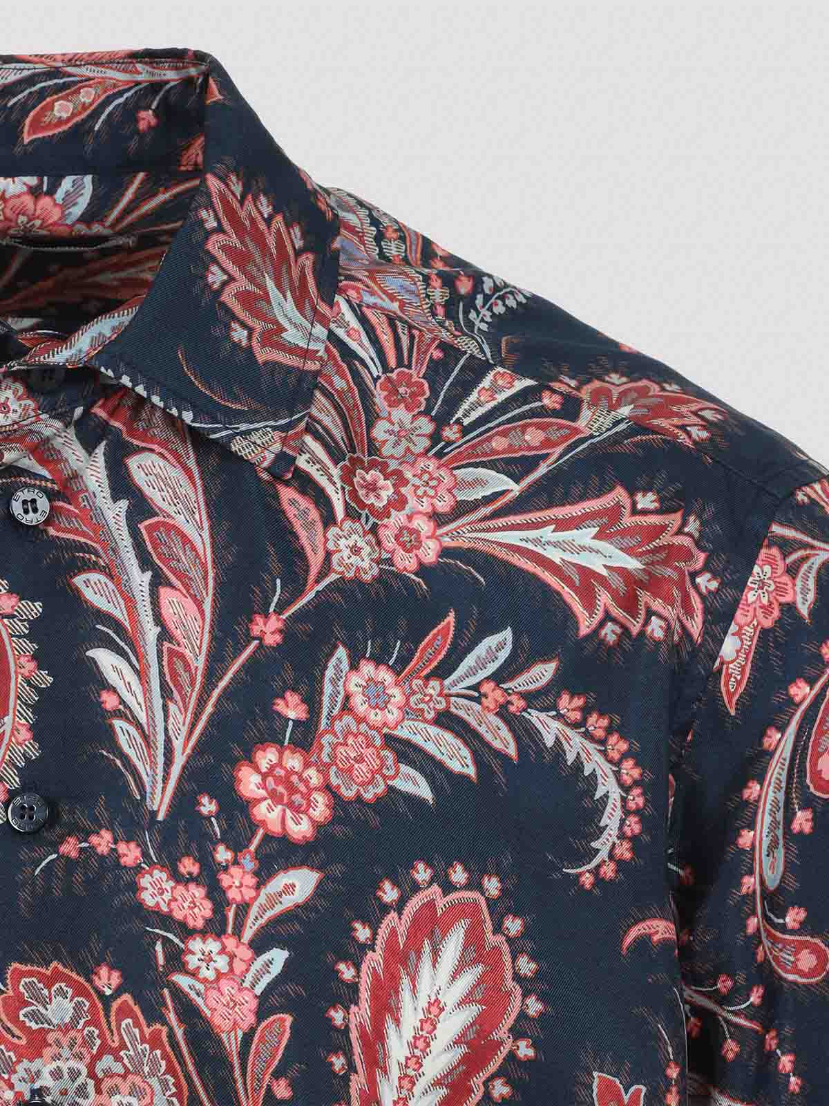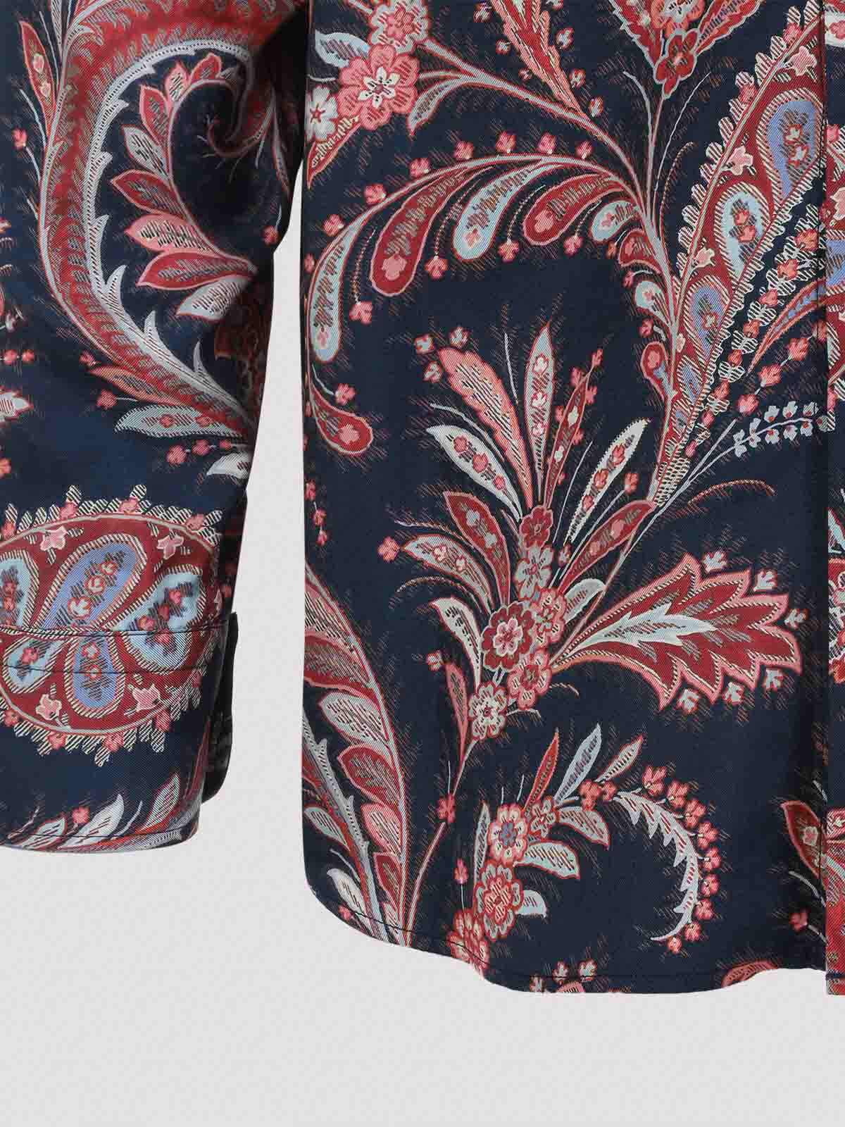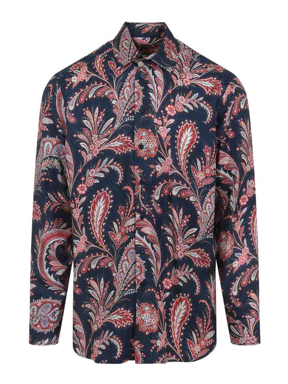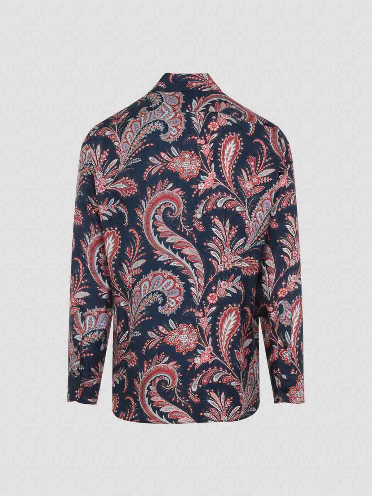 Etro blue silk roma shirt. pure silk shirt, pointed collar, front buttoned fastening, long sleeves, buttoned cuffs, round hem. blue background with printed red multicolored paisley design all-over.