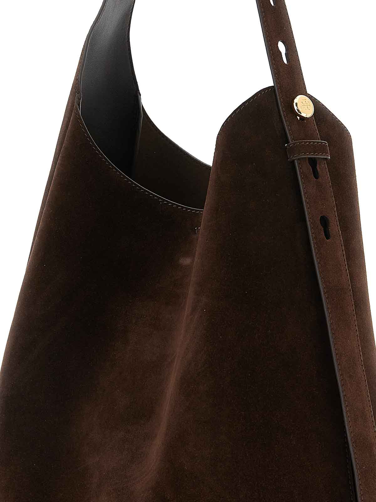 Romy hobo suede shoulder bag with adjustable handle and inner snap hook closure.