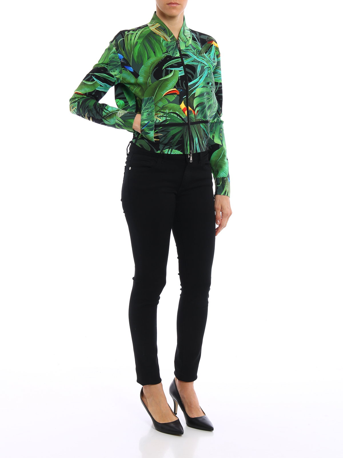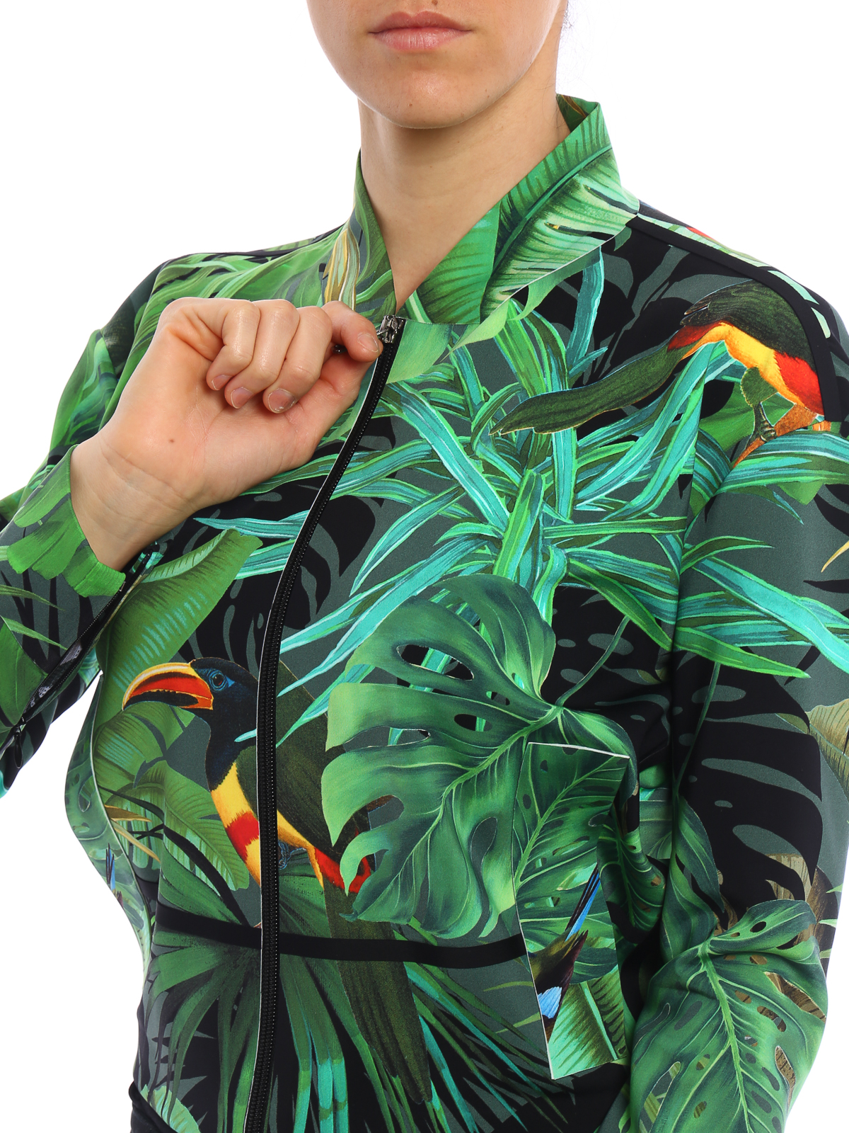 Jungle inspired printed high-tech fabric bomber featuring zip fastening, two front welt pockets, zipped cuffs, elasticated bottom and meshwork fabric lining.