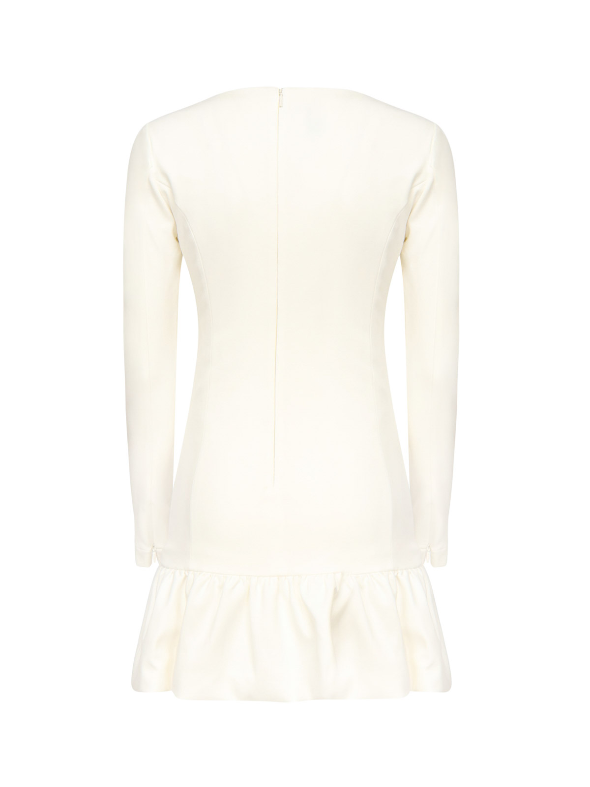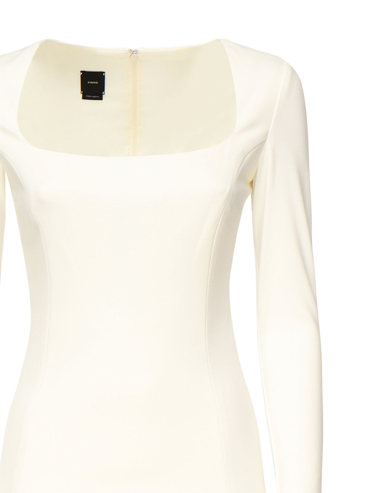 Wide round neckline at the zip at the back long sleeves size shown in photo is it color white