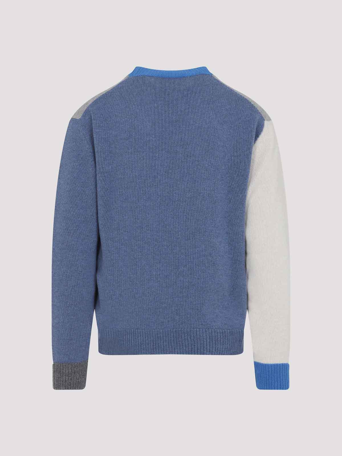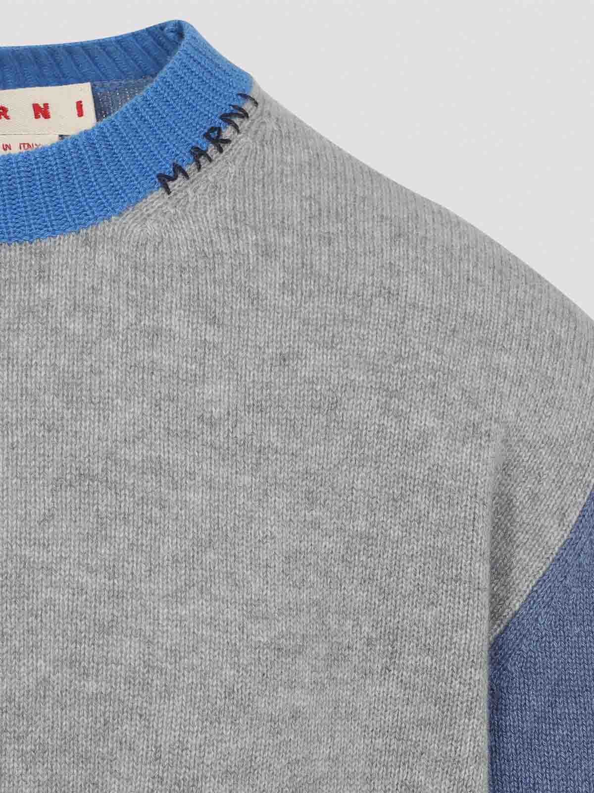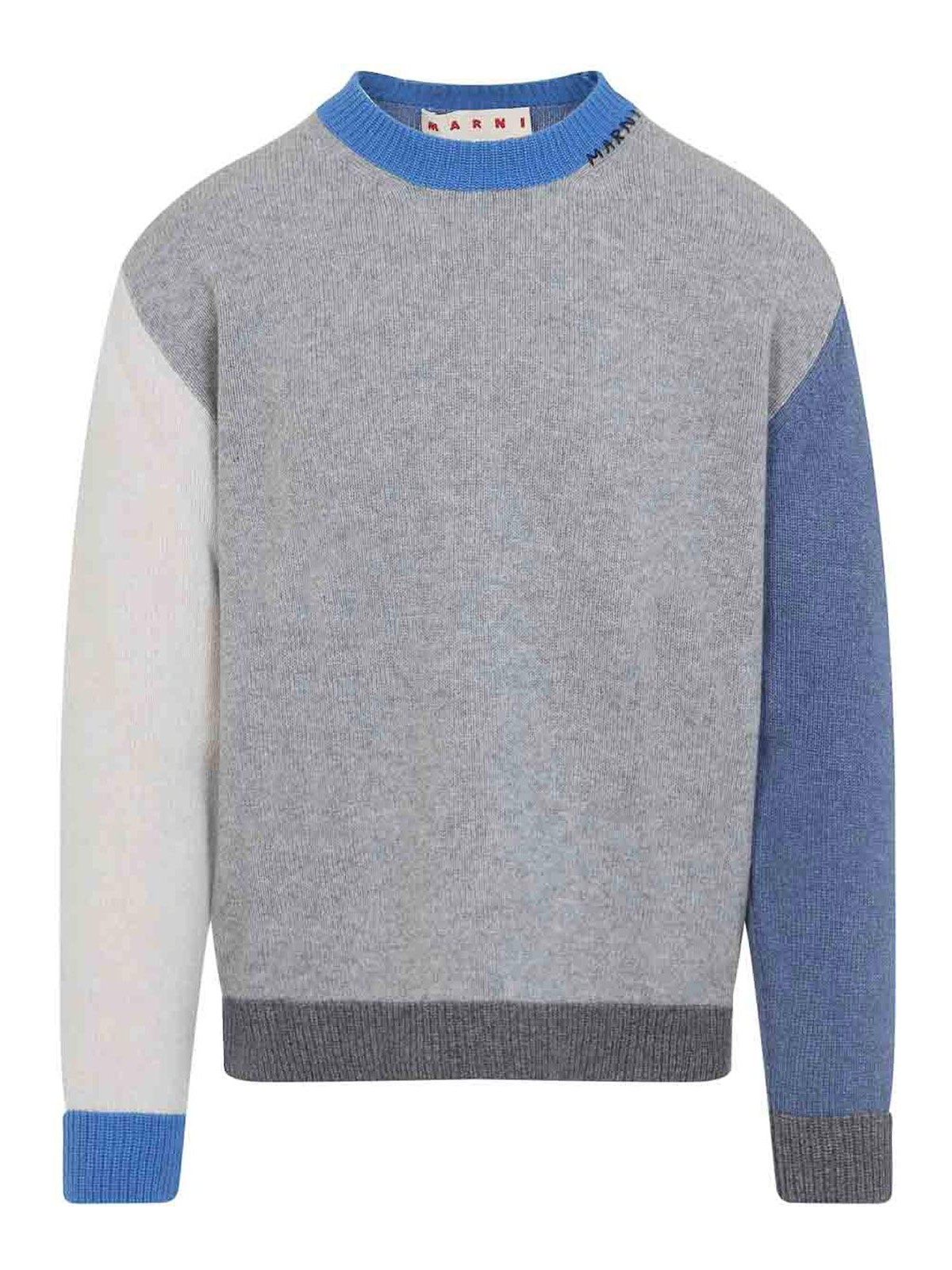 Marni roundneck grey pullover crafted from pure with white grey and light blue block construction round neckline with embroidered logo dropped shoulders ribbed edges