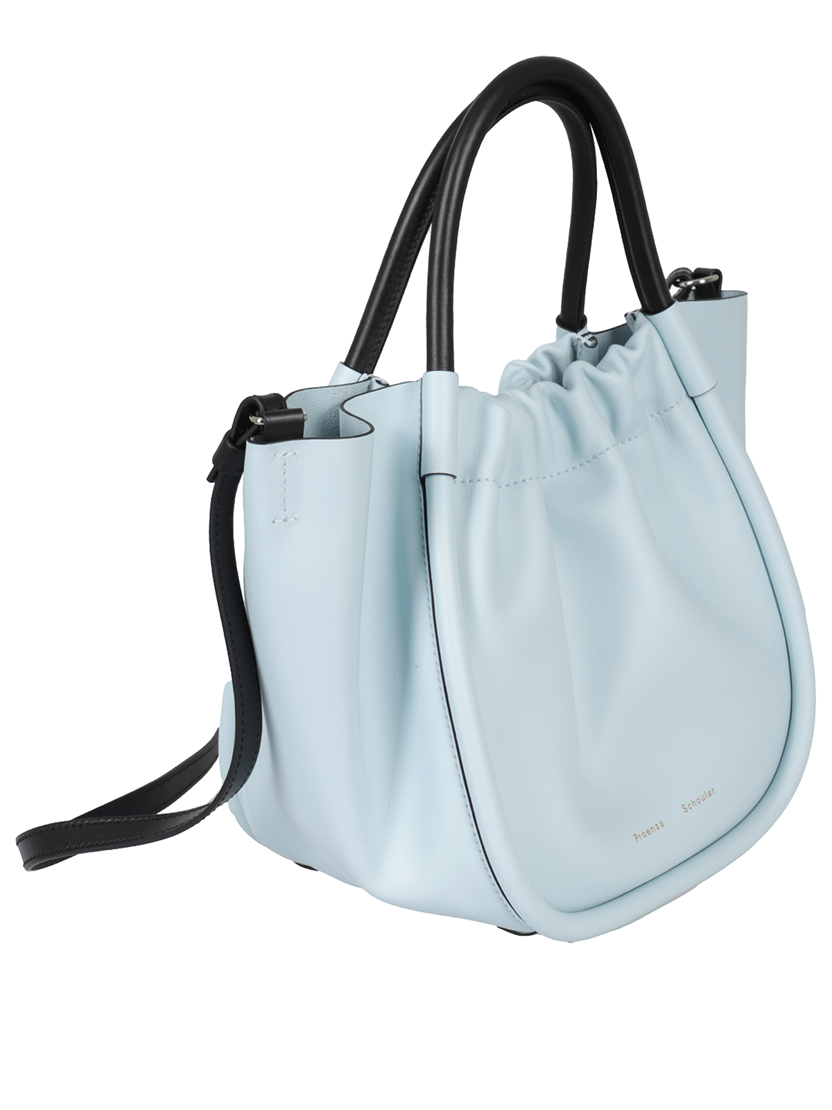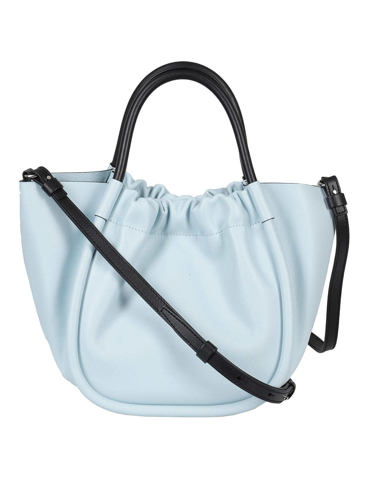 Ruched smooth leather tote. Adjustable and removable shoulder strap.