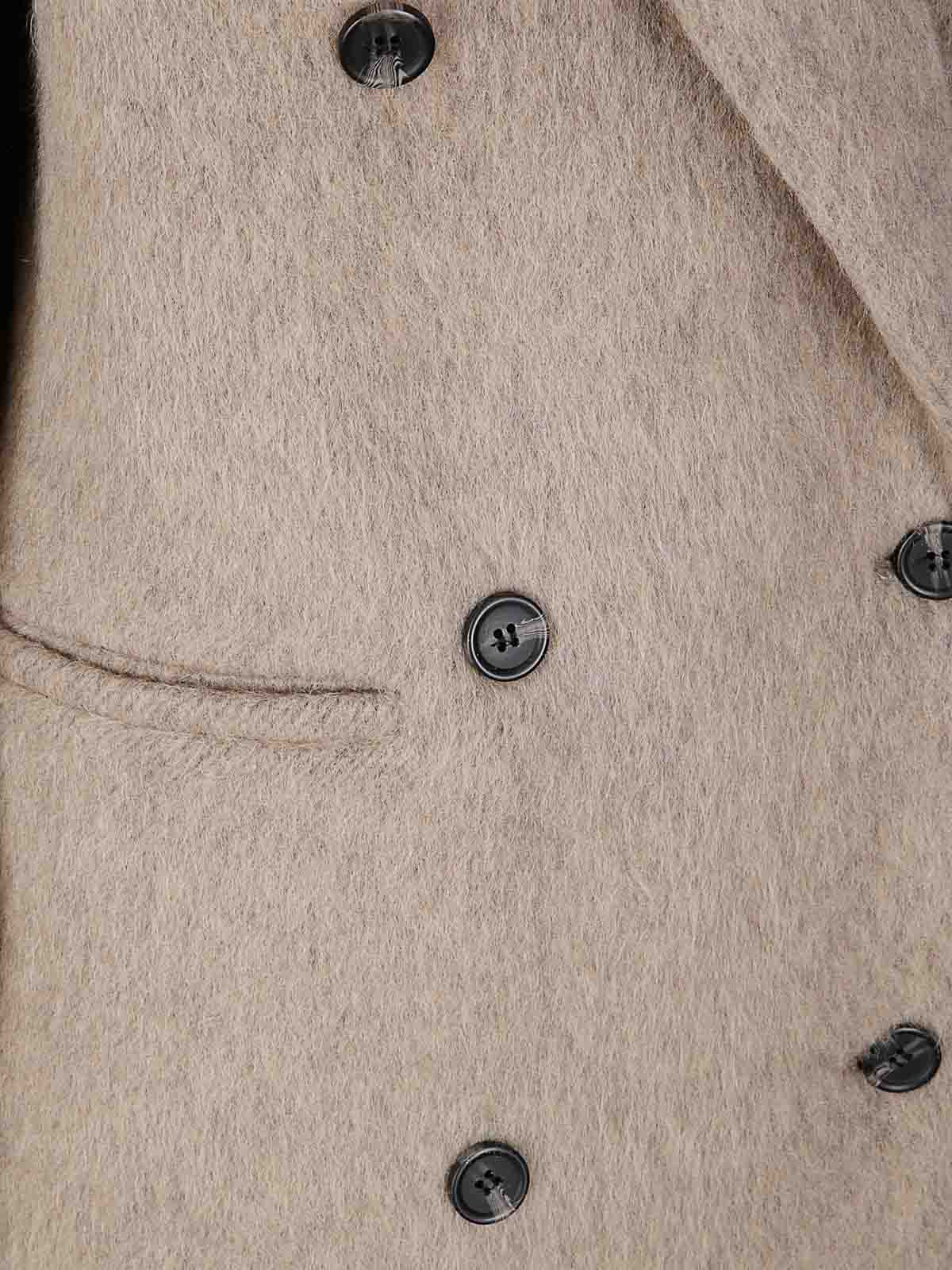 Brushed wool coat, double-breasted closure, front pockets, contrasting buttons.