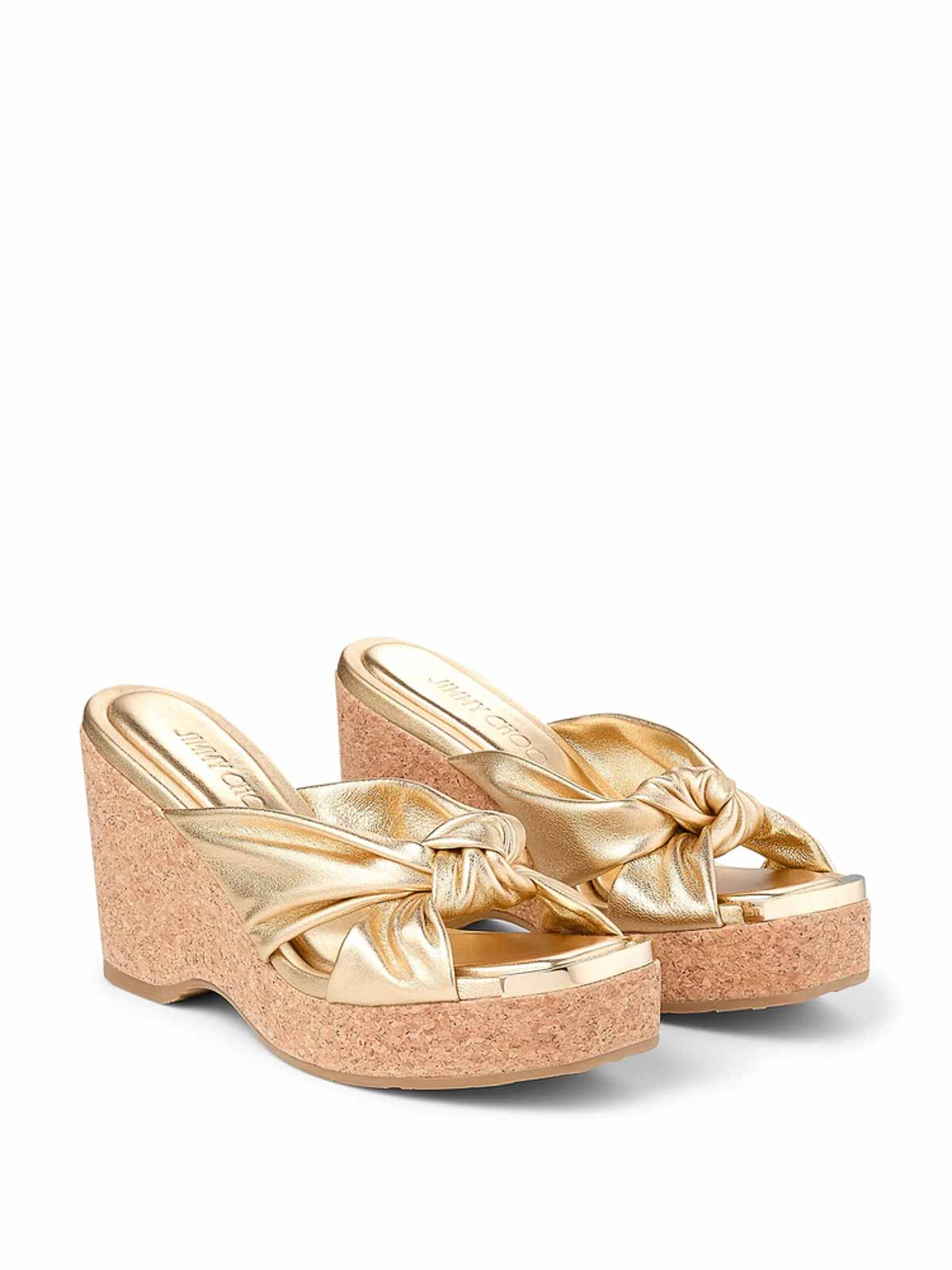 Gold-tone calf leather laminated finish metallic effect high wedge heel knot detailing square open toe branded footbed platform sole