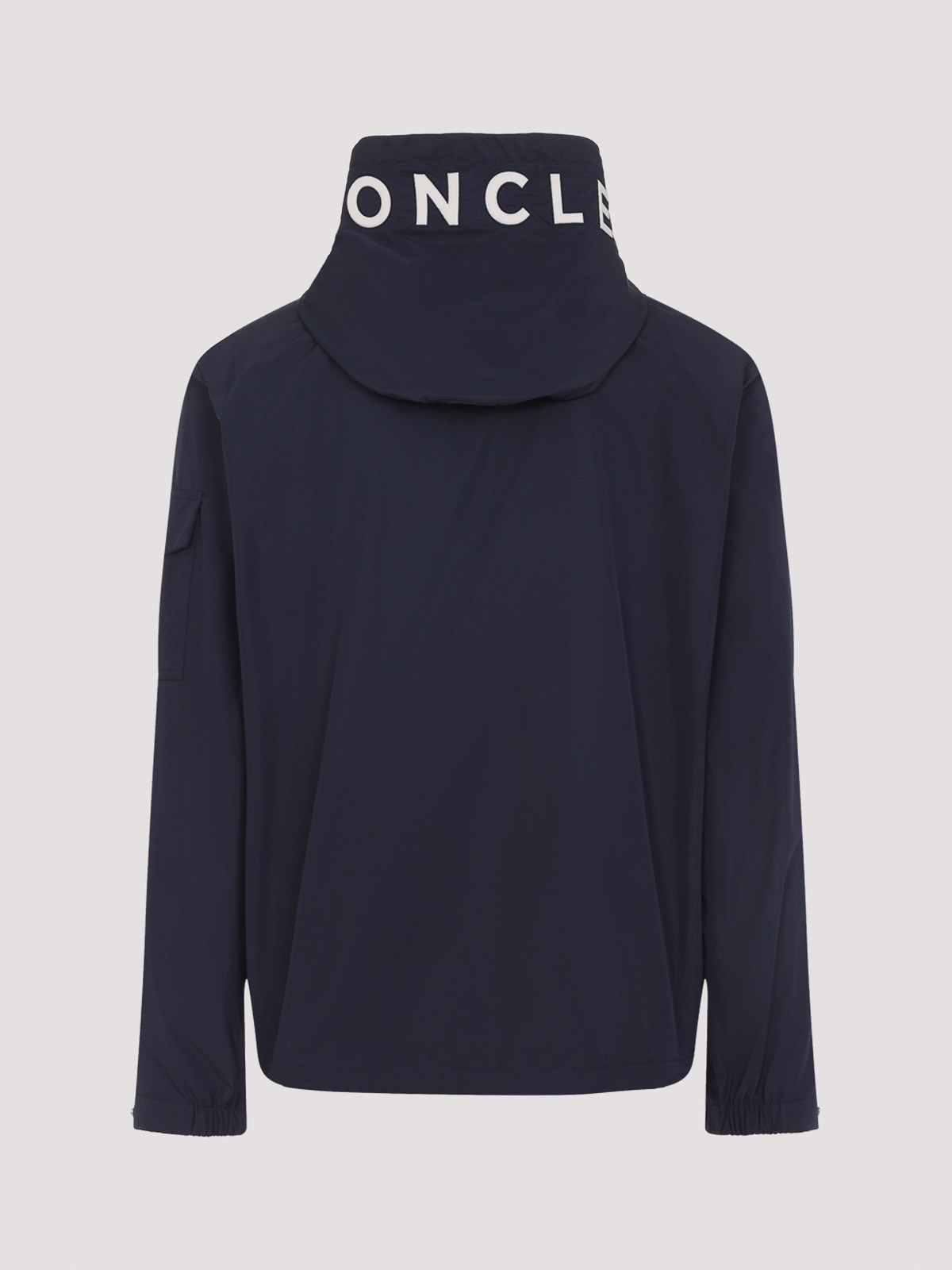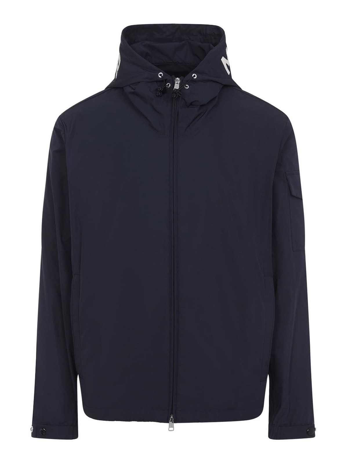 Moncler dark blue sassiere jacket. pure dark blue polyester jacket, stand-up collar, tonal hood with contrasting white lettering logo, front zipped fastening, side slit pockets, long sleeves, flap buttoned pocket with patch logo on the right sleeve, buttoned cuffs, straight hem.