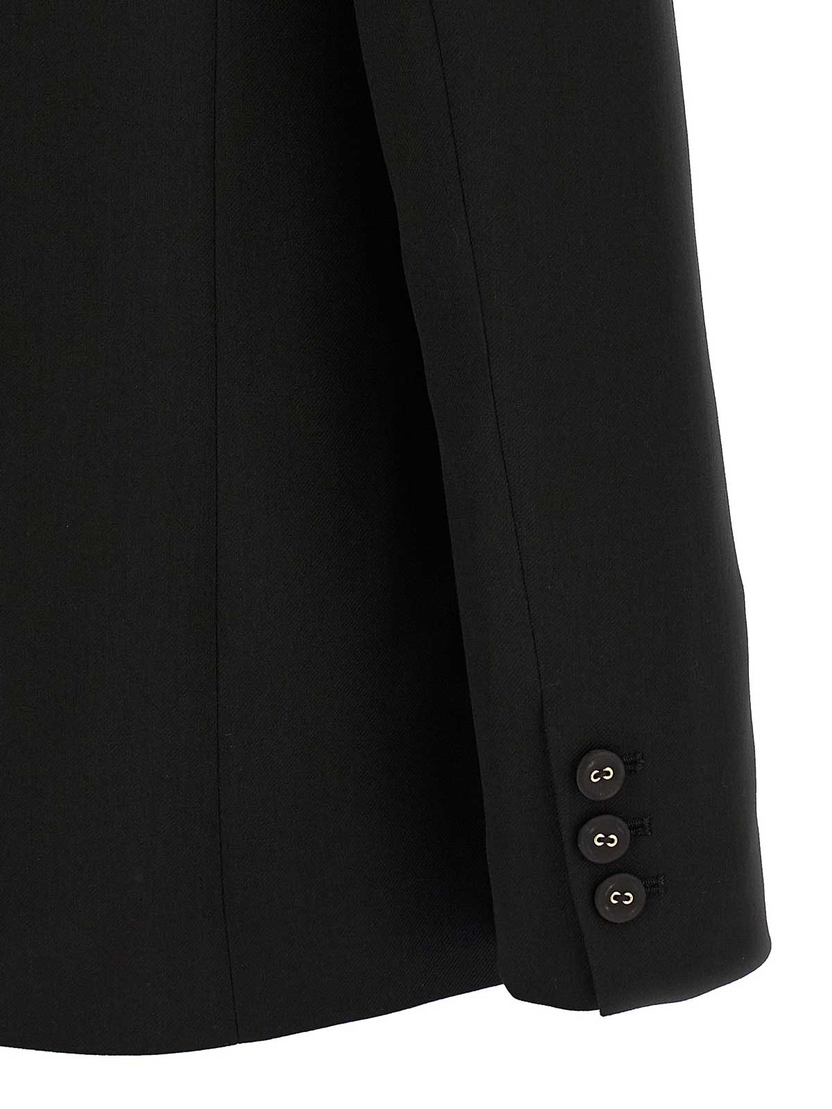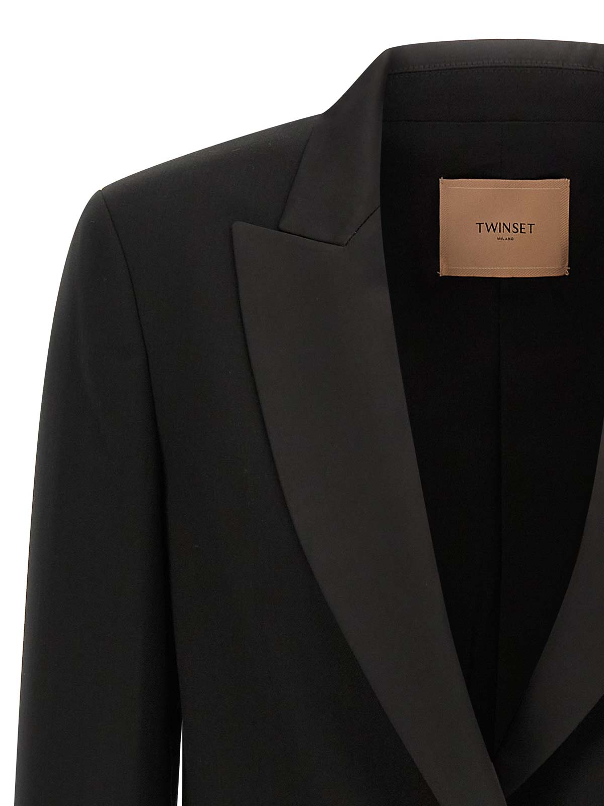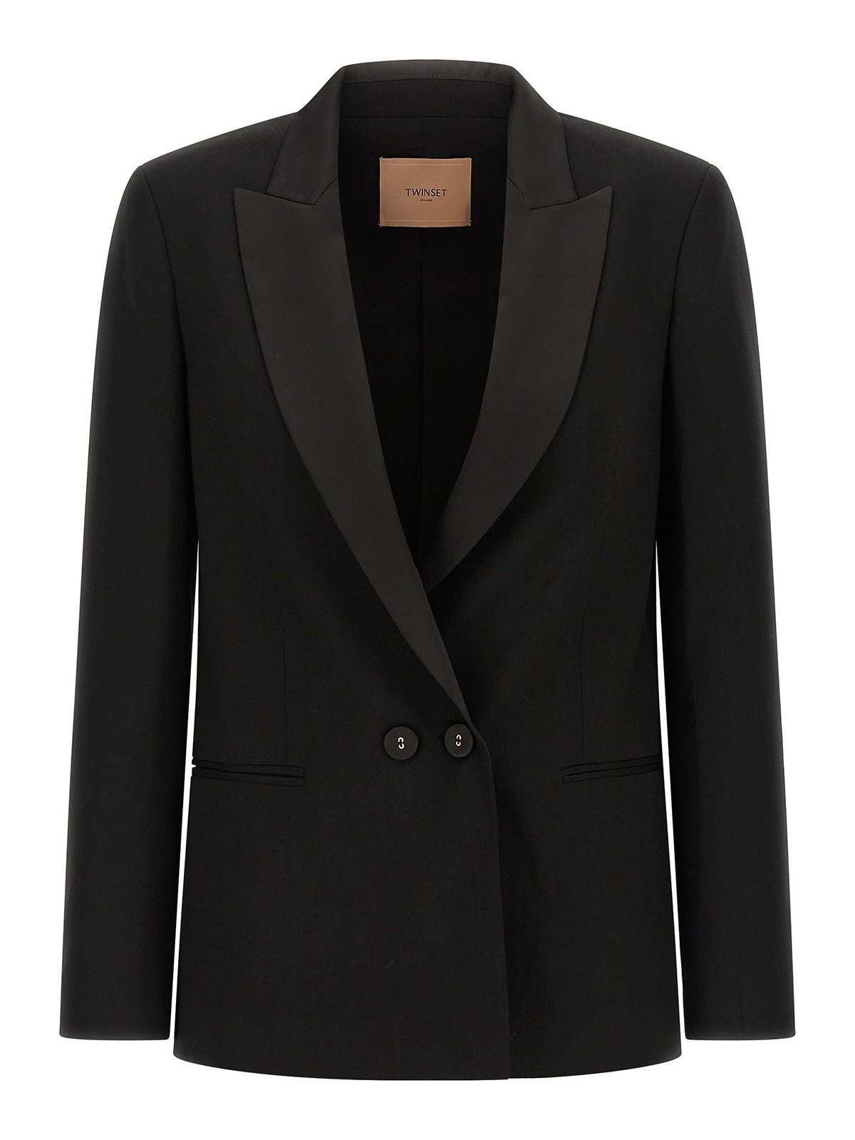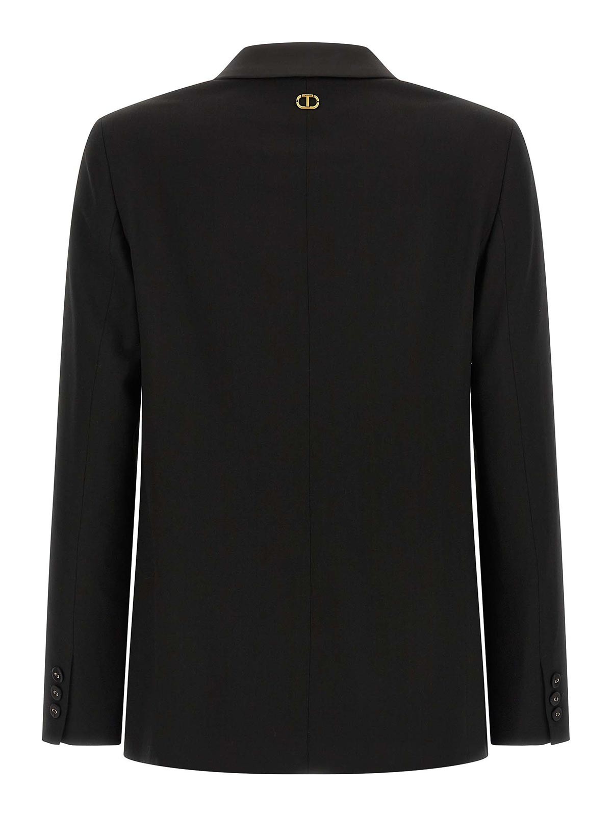 Double-breasted blazer in wool and viscose blend twill with front button closure, tone-on-tone satin collar and lapels, antiqued effect metallic oval t logo at the back, patch pockets, structured shoulder strap, lining.