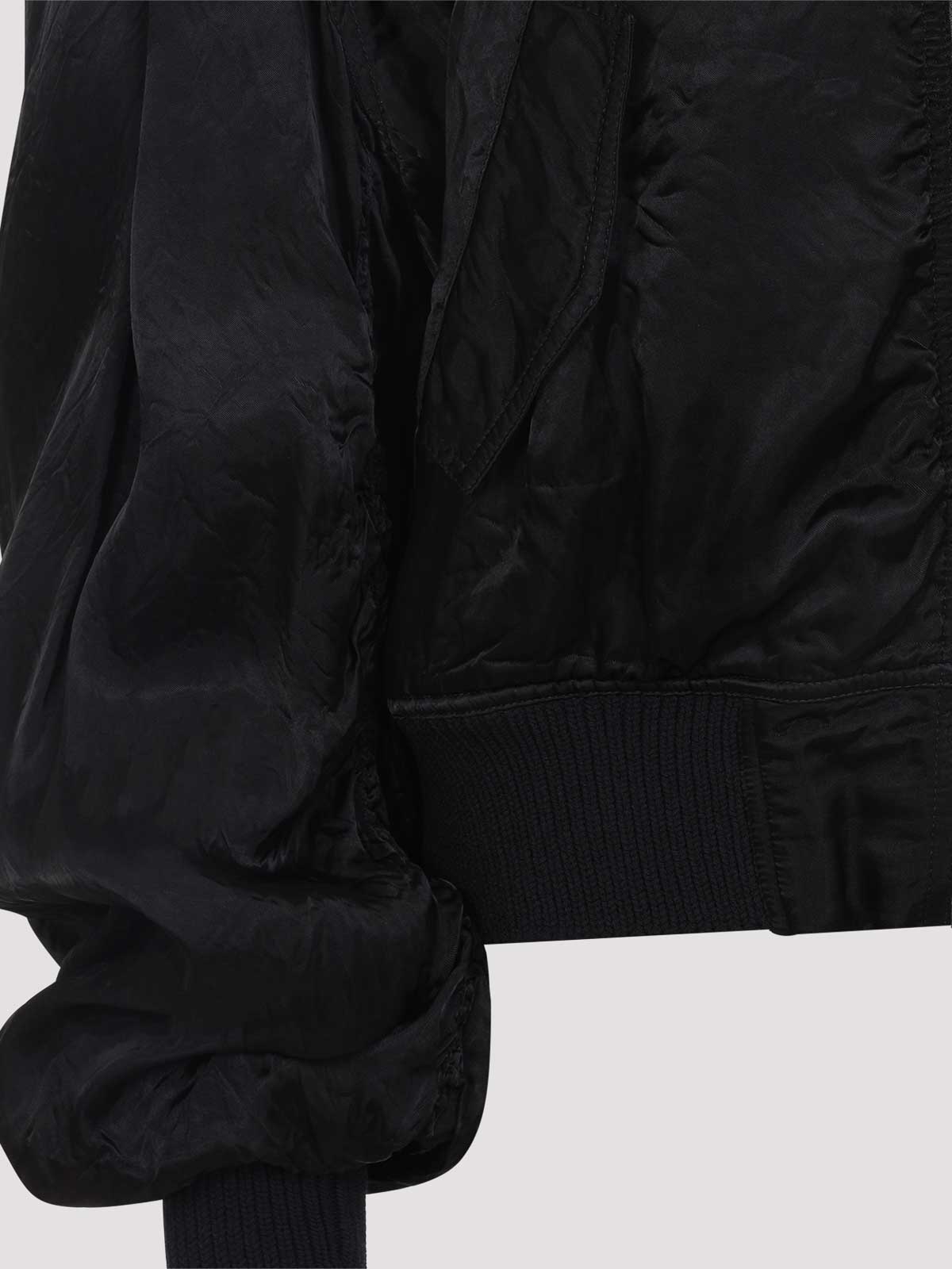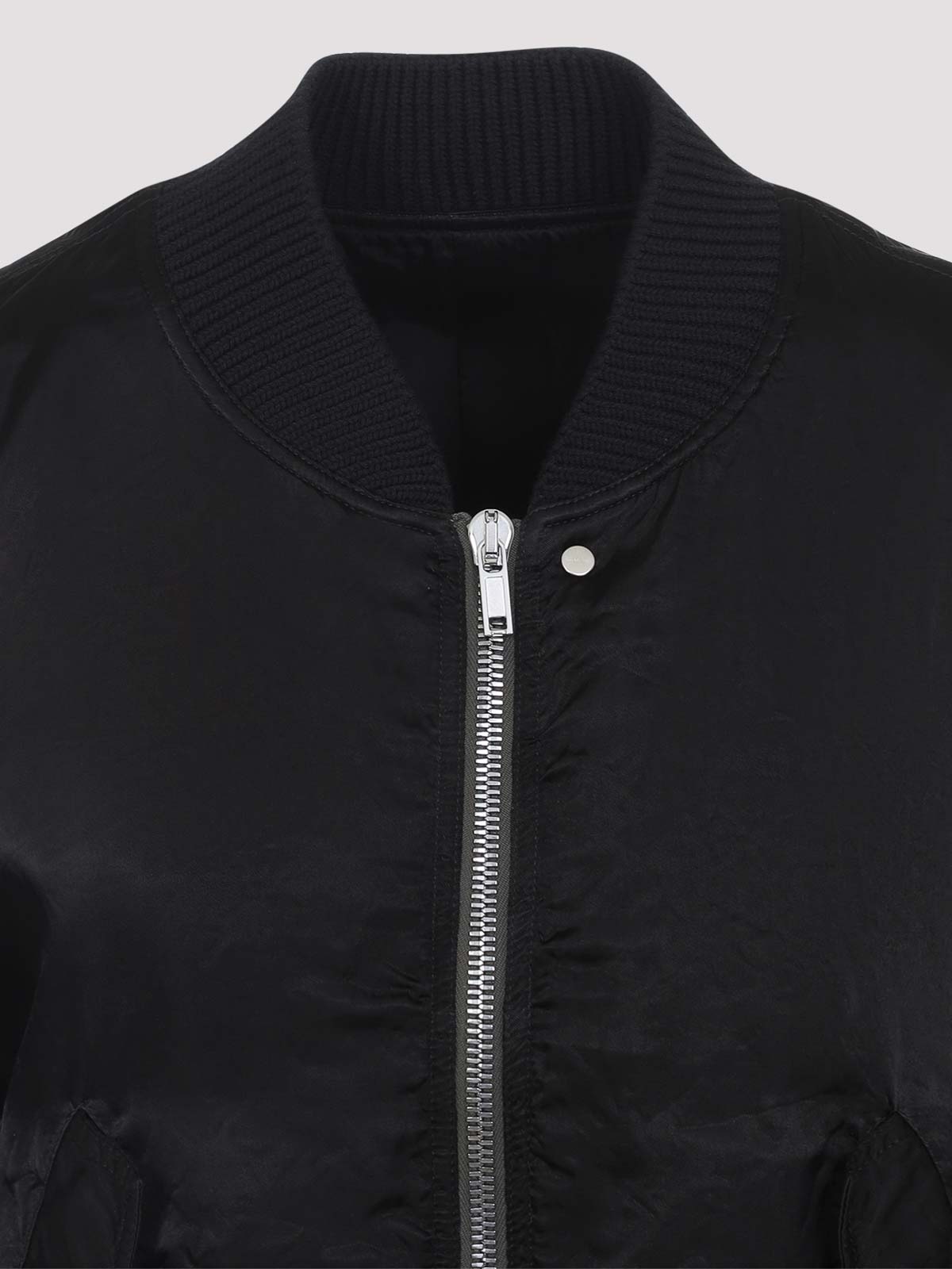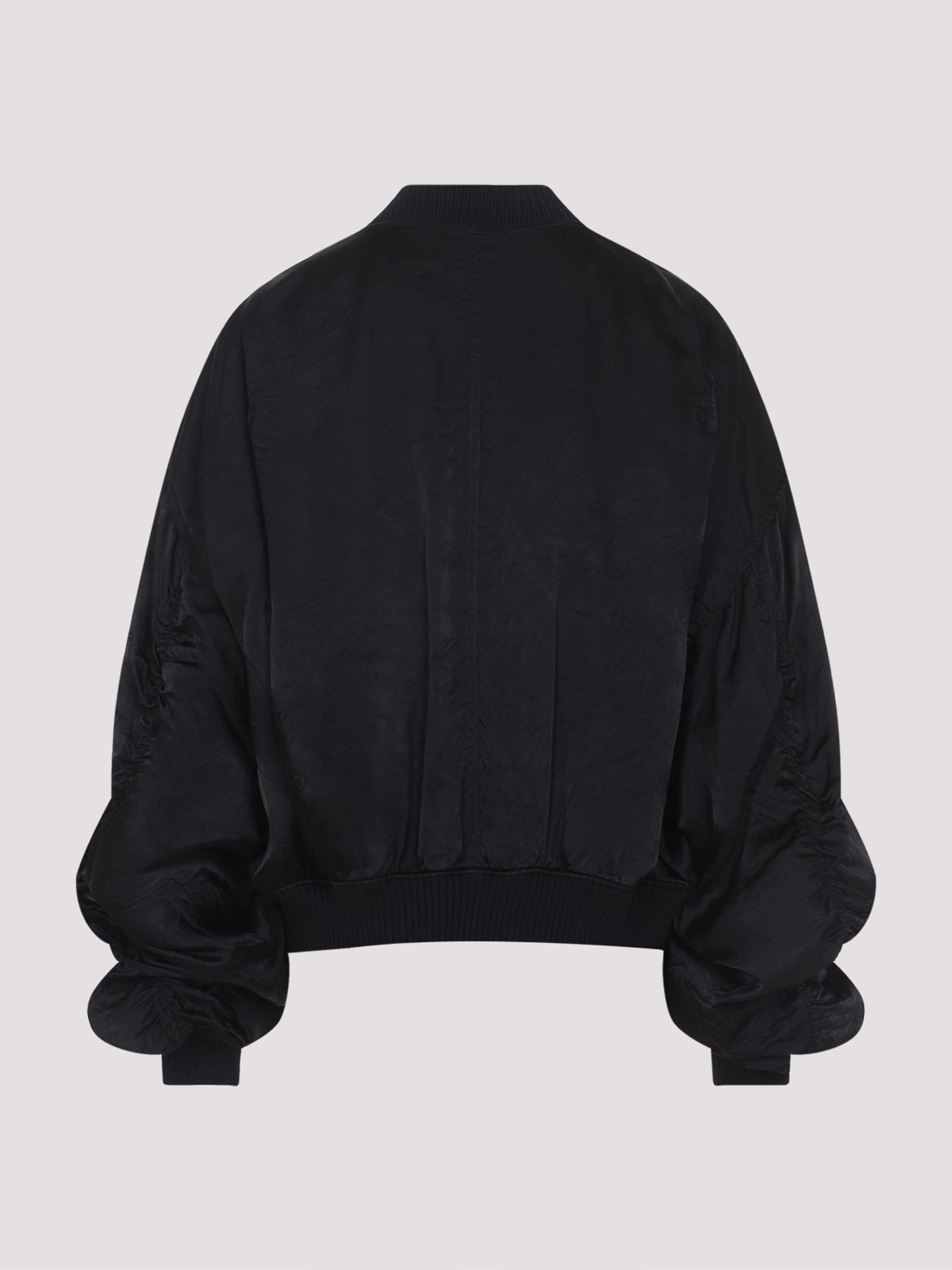 Rick owens secchia flight black cupro jacket. oversized jacket crafted from black semi-shiny cupro, featuring a round neckline, front zip fastening, two front flap pockets, dropped shoulders, gathered wide sleeves, ribbed edges, and a full lining.