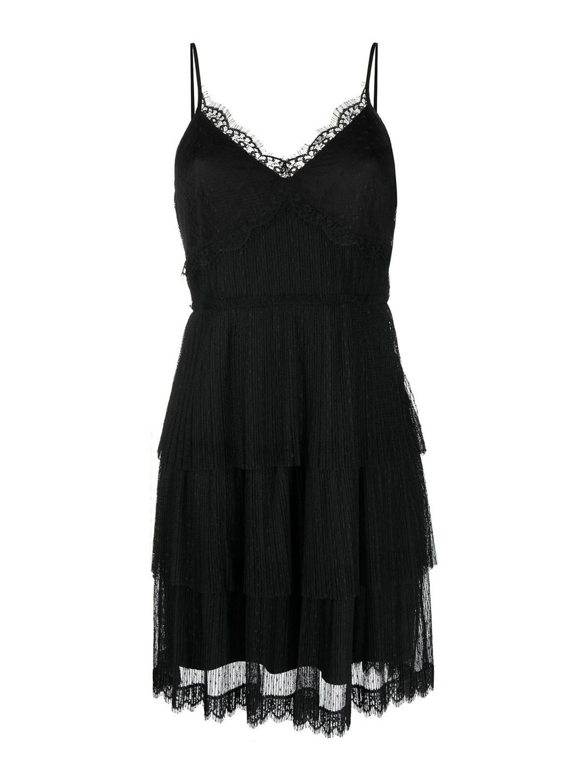 Semi-sheer lace dress v-neck, thin straps, lace overlay, lace trim and semi-sheer construction.