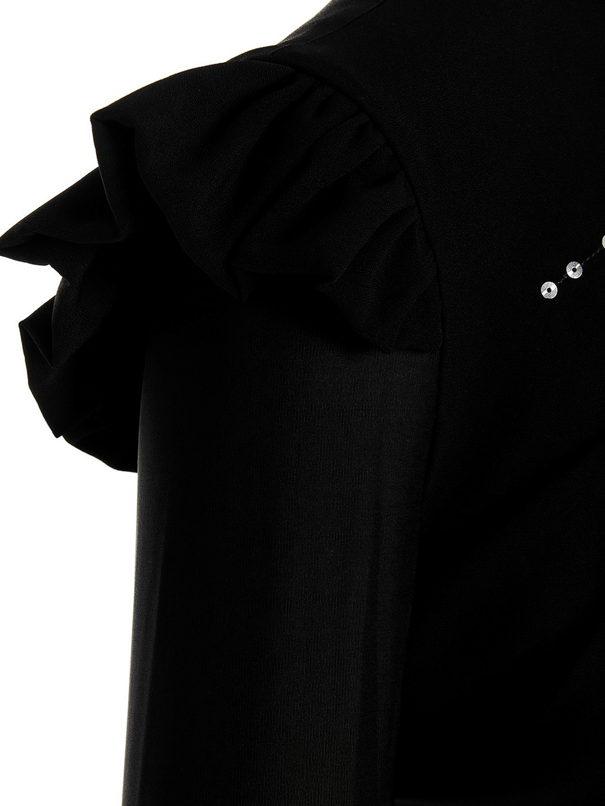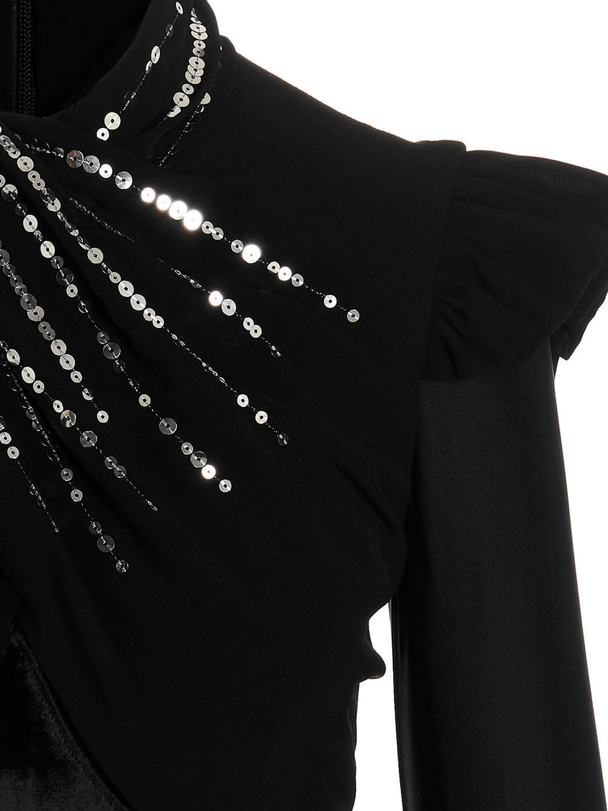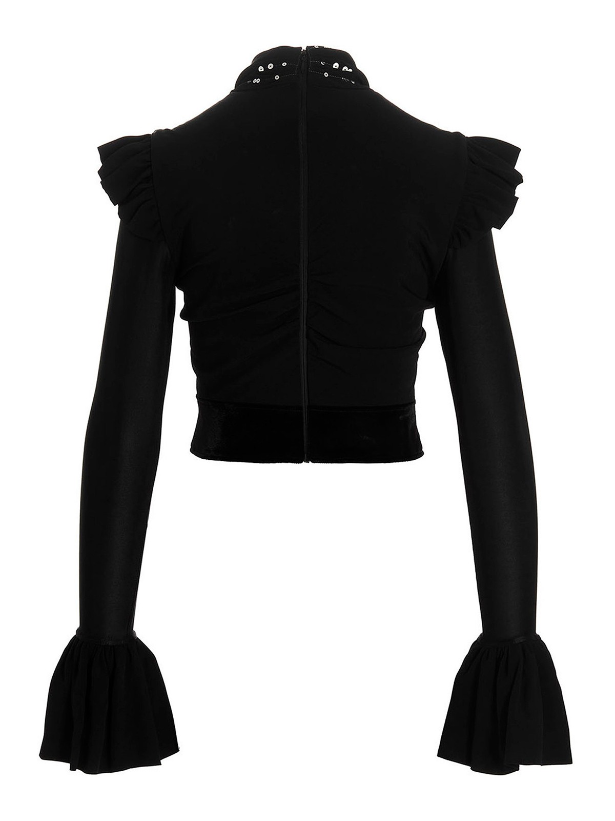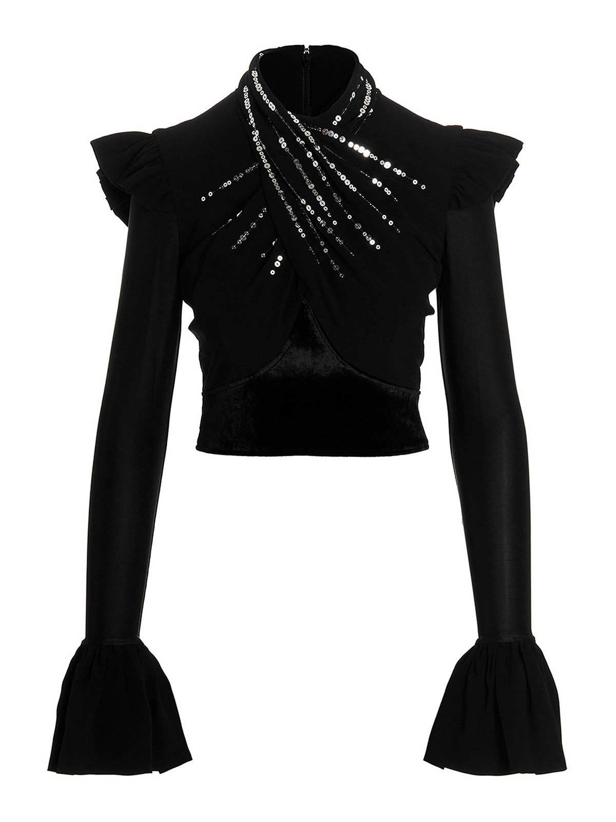 Stretch fabric top with velvet inserts, front draping detail with sequin appliqus, long cuffed sleeves, shoulder ruffles, back zip closure and a cropped style.