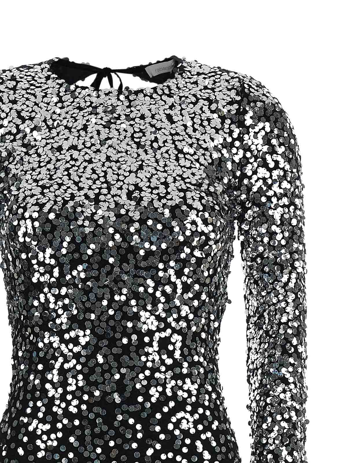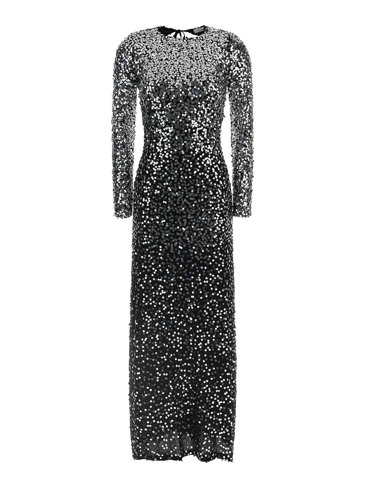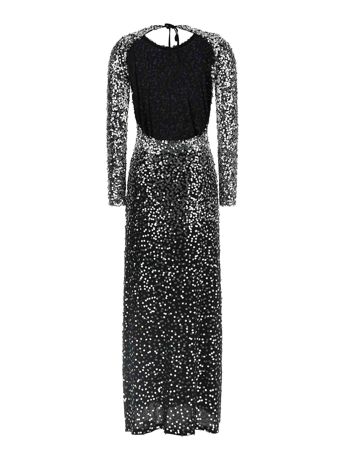 Long dress in second-skin stretch jersey with all-over sequin appliqu, round neckline with drawstring to tie behind the neck, long sleeves, lining, wide back cut-out with bare back.