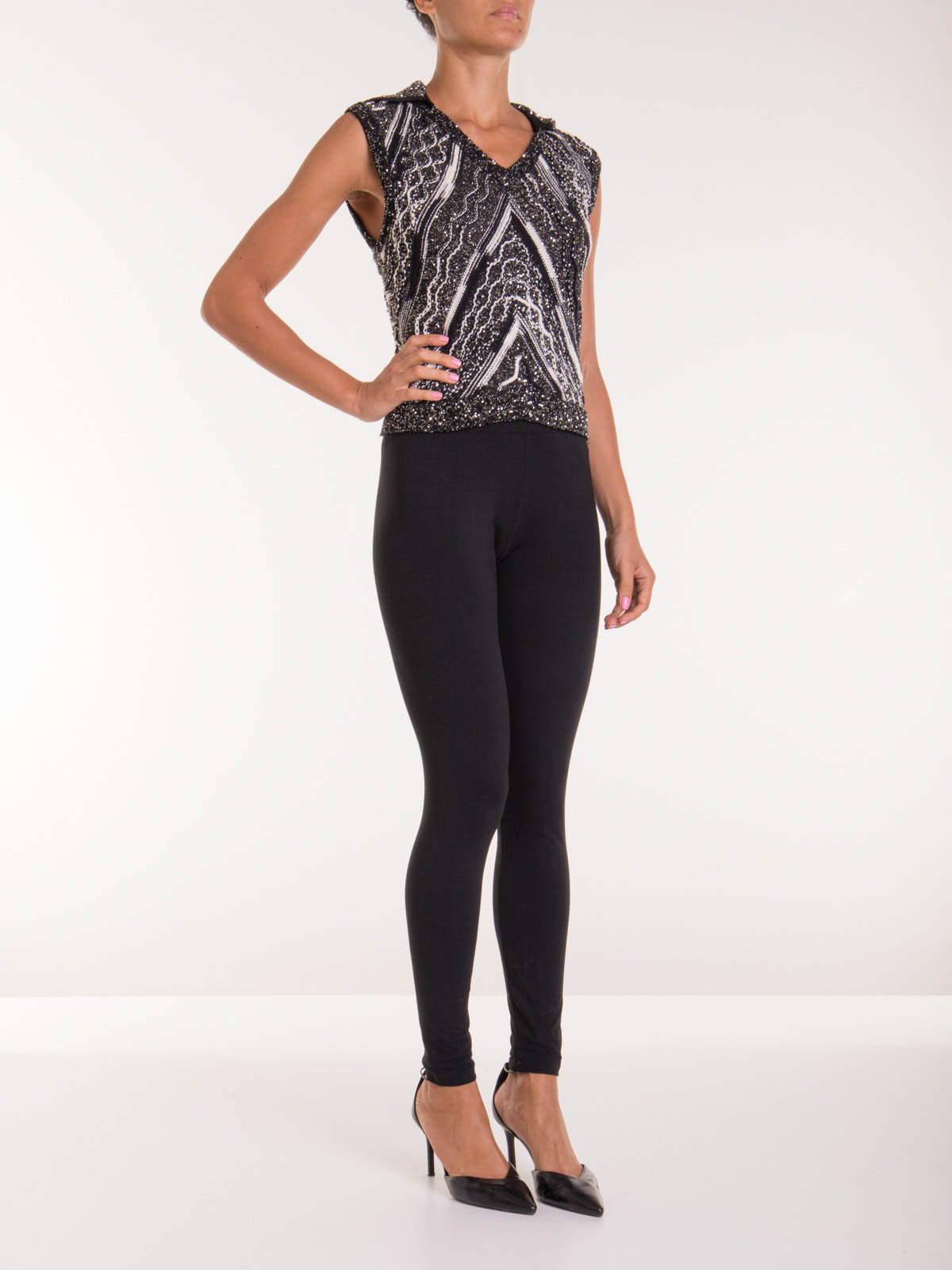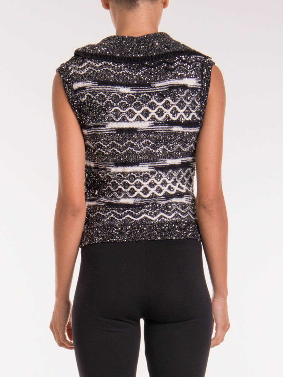 Wool blend V neck top featuring all over sequin trimming and pointy collar.