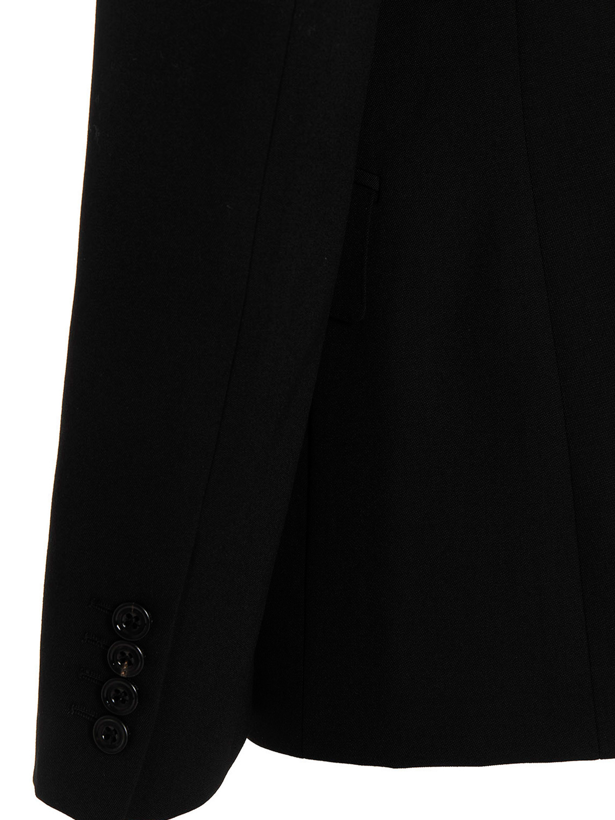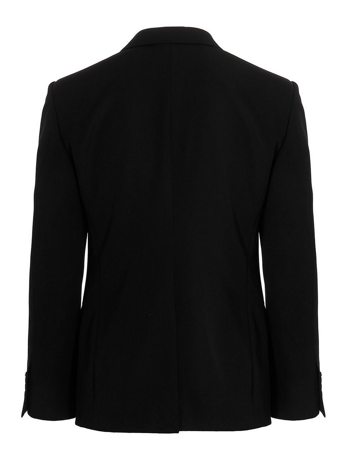 Wool blazer with sequin application on the lapel, featuring a single-breasted style with button closure, pockets, long sleeves, padded shoulder pads, back vent.