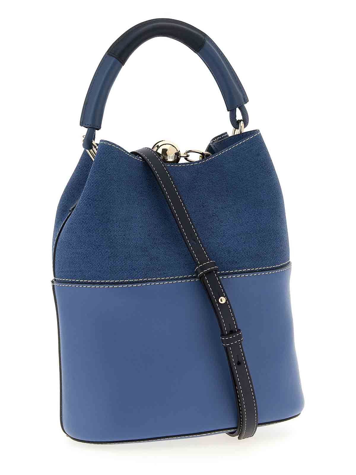 furla sfera s' bucket bag in smooth leather and printed suede with denim effect, contrast stitching, front embossed logo, fixed handle, magnetic closure, inner metal strap with interlocking ball hardware, clutch bag, adjustable and removable shoulder strap.