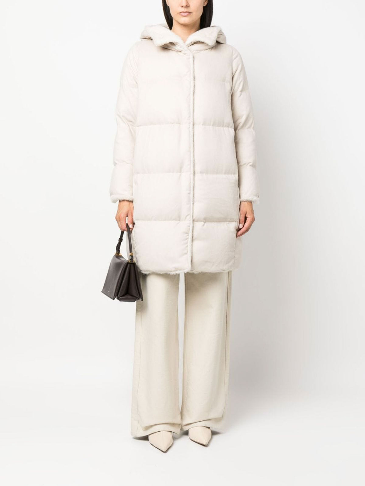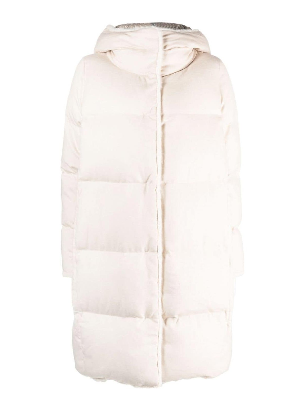 Light beige shearling-lined puffer coat from herno featuring light beige cashmere-silk blend padded design shearling lining classic hood logo print at the hood long sleeves concealed front fastening thigh-length and straight hem size it