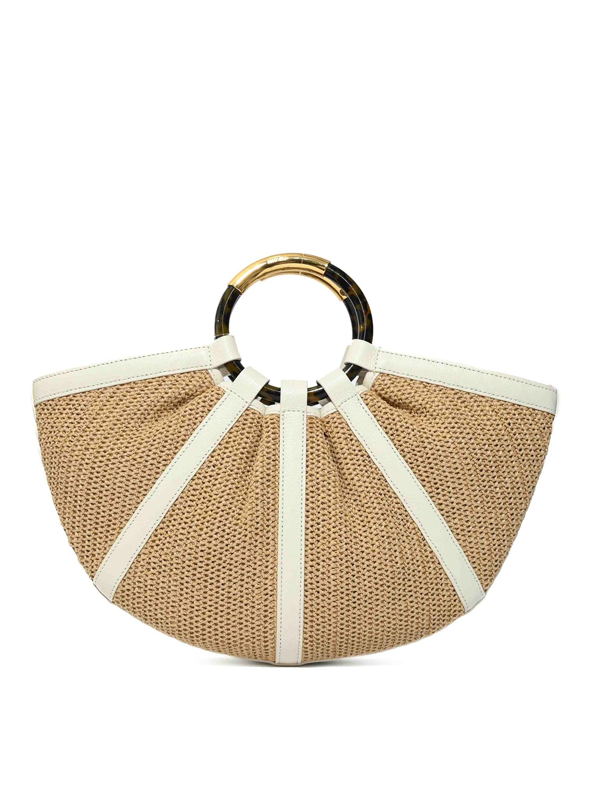 Women's straw and leather bag, ladybirds, large shell model, material: woven straw and leather, pattern: solid colour, closure: zip, handles/shoulder strap: double rigid ring handles, pockets: internal compartment, details: tortoiseshell effect plexiglass handles with golden finishes, leather inserts, semi-rigid structure, lined: s, capacity: large, fit/carry: by hand, over the shoulder