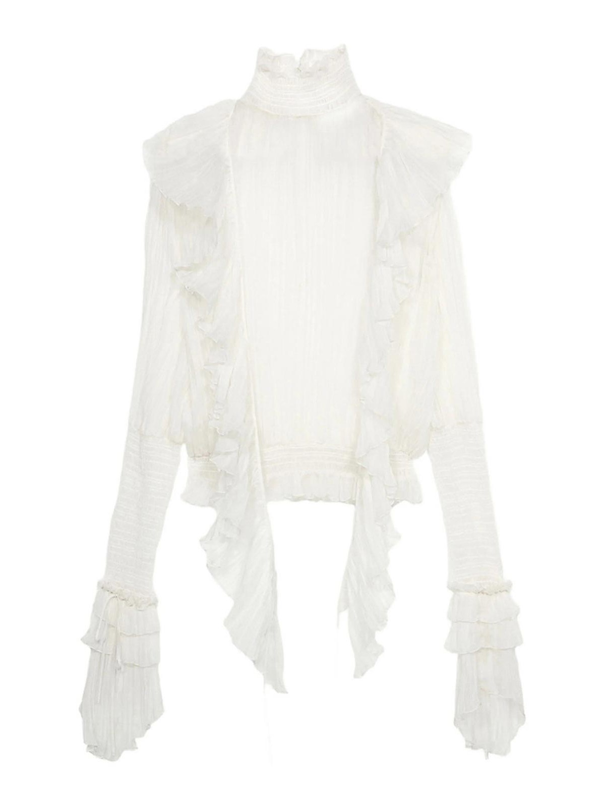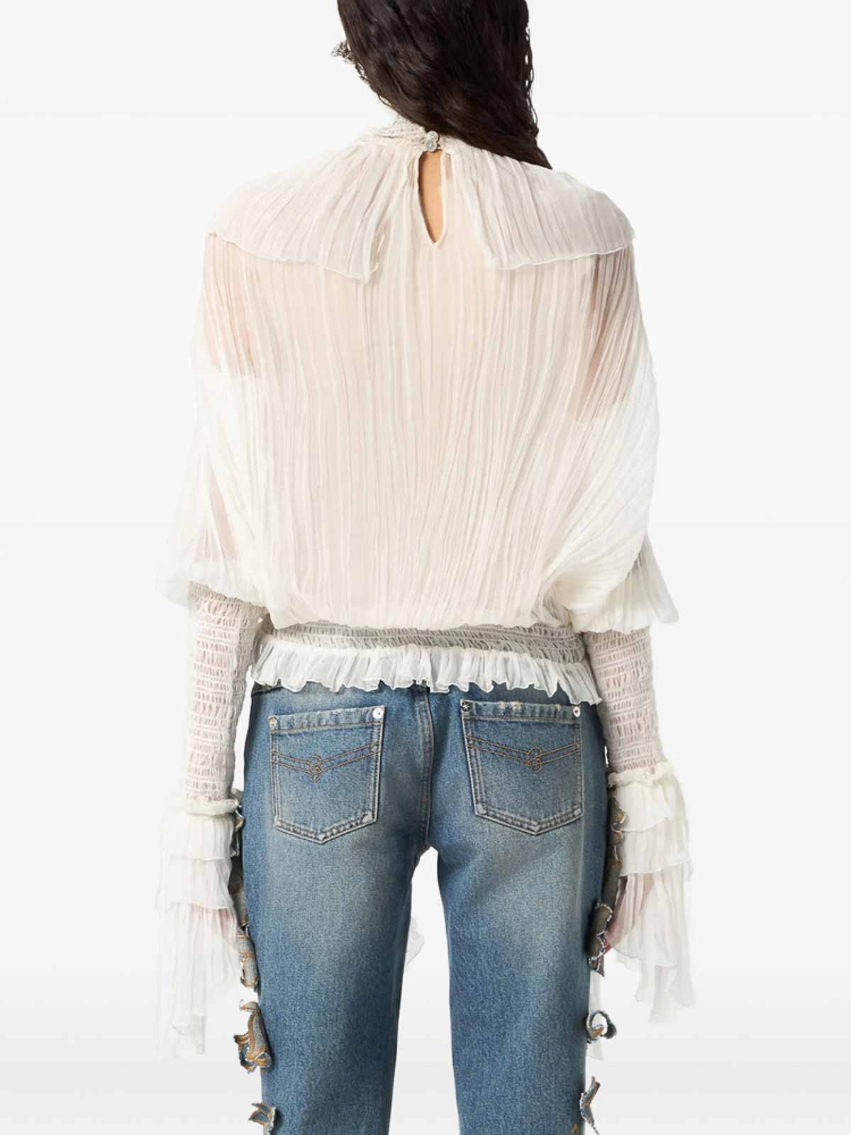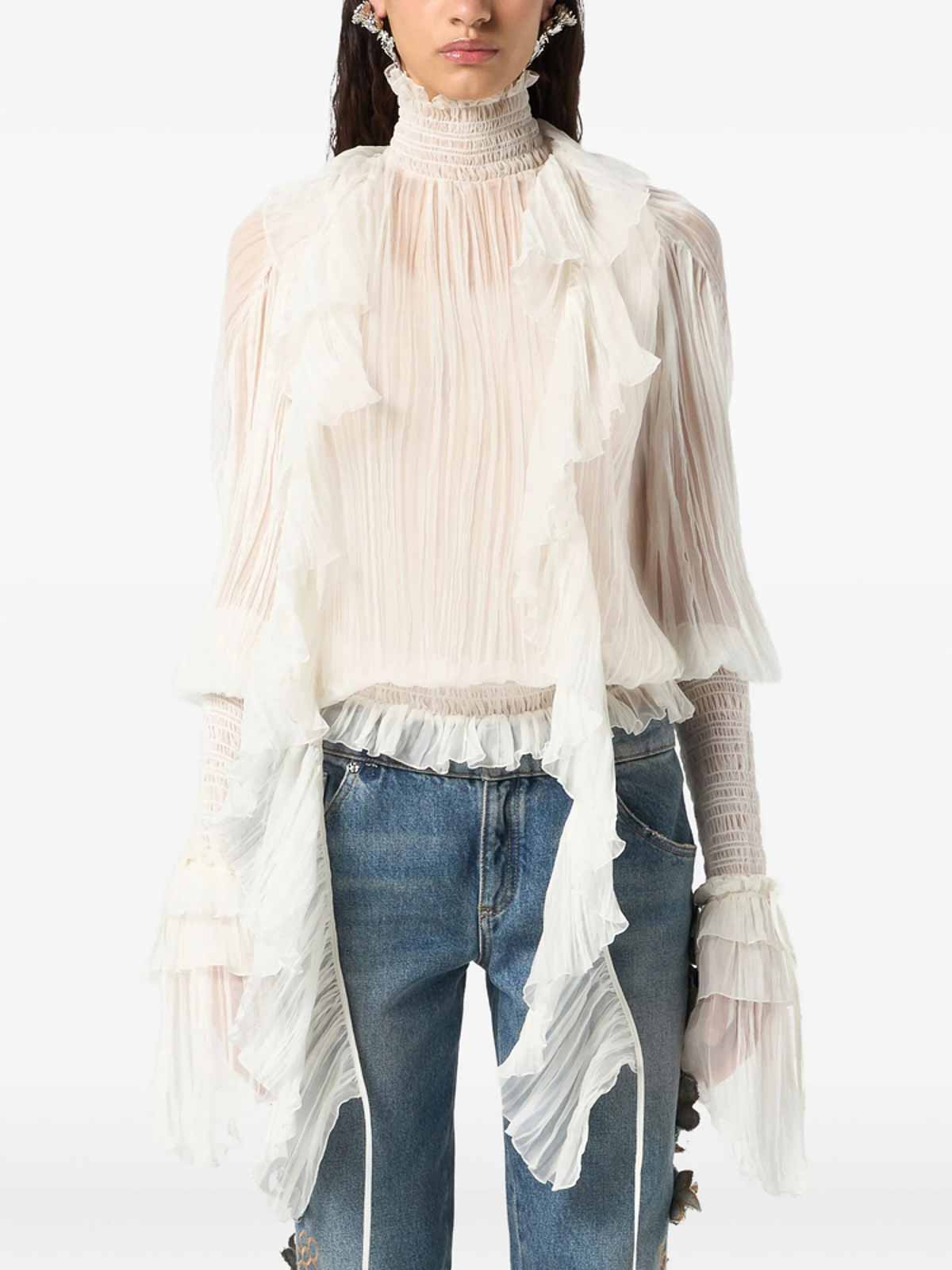 Off-white pleated texture high neck ruffle detail long sleeves smocked cuffs