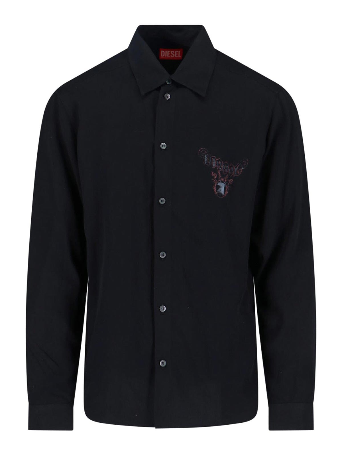 Diesel s-holger shirt in black viscose, collar, button closure, long sleeves, printed detail on the front, straight hem.