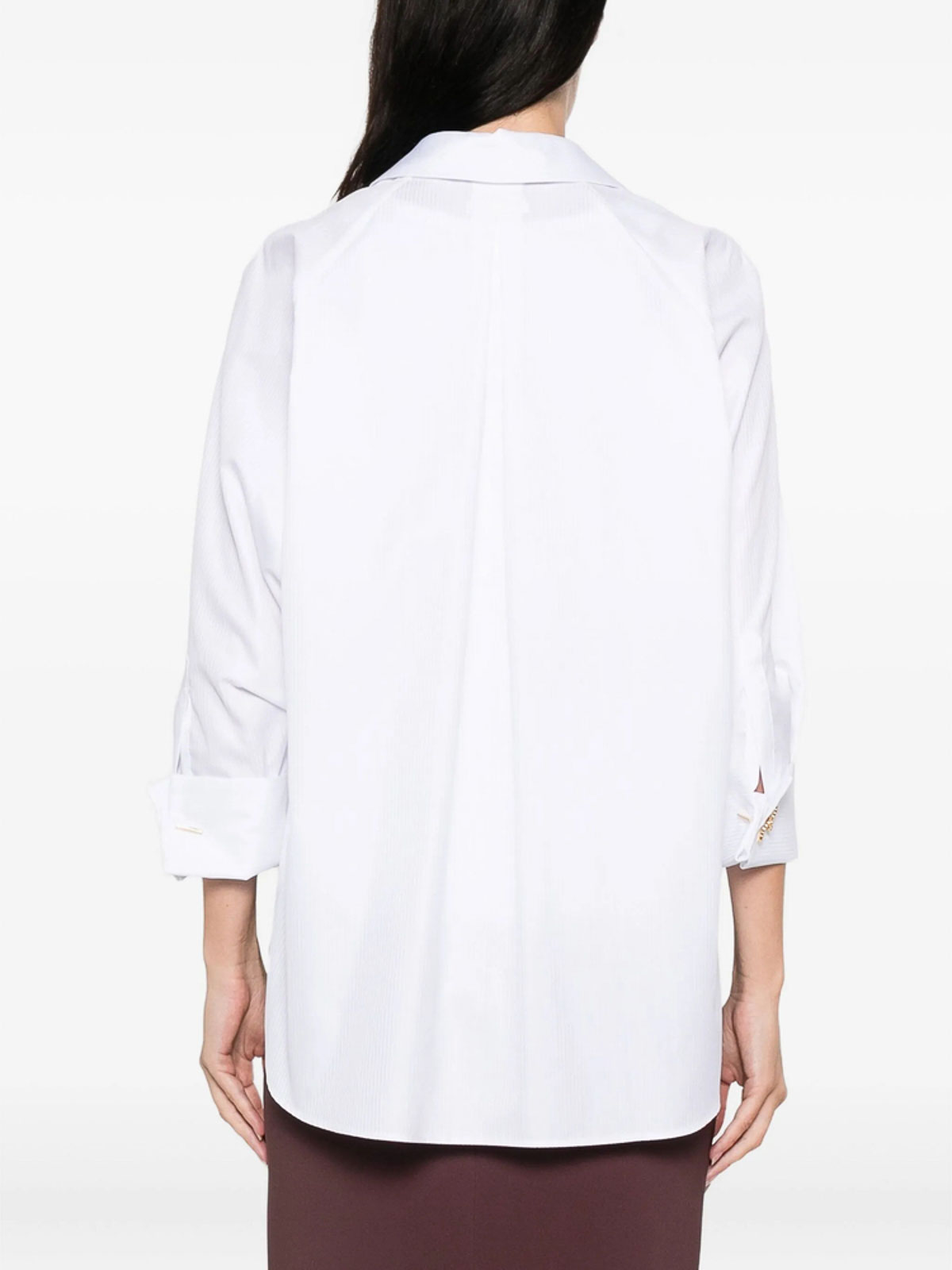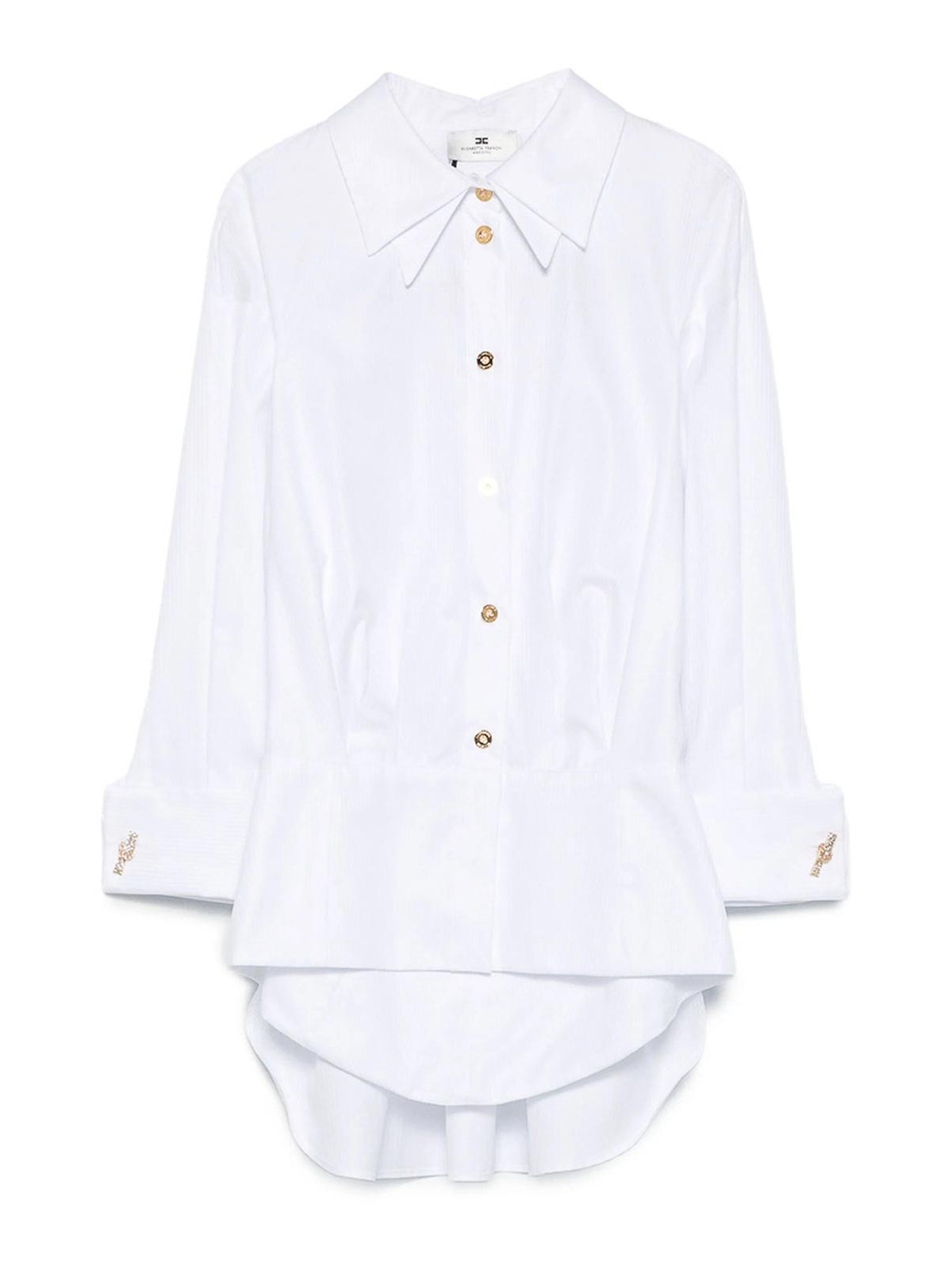 White, tone button embellishments long sleeves double, collar neckline tiered peplum hem