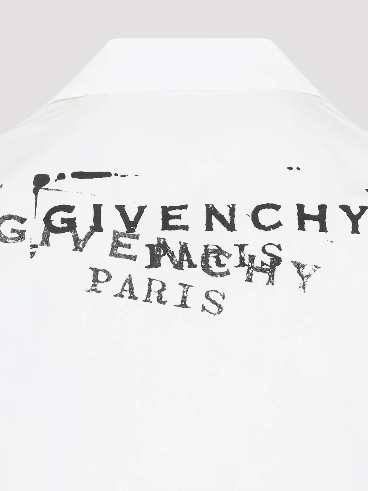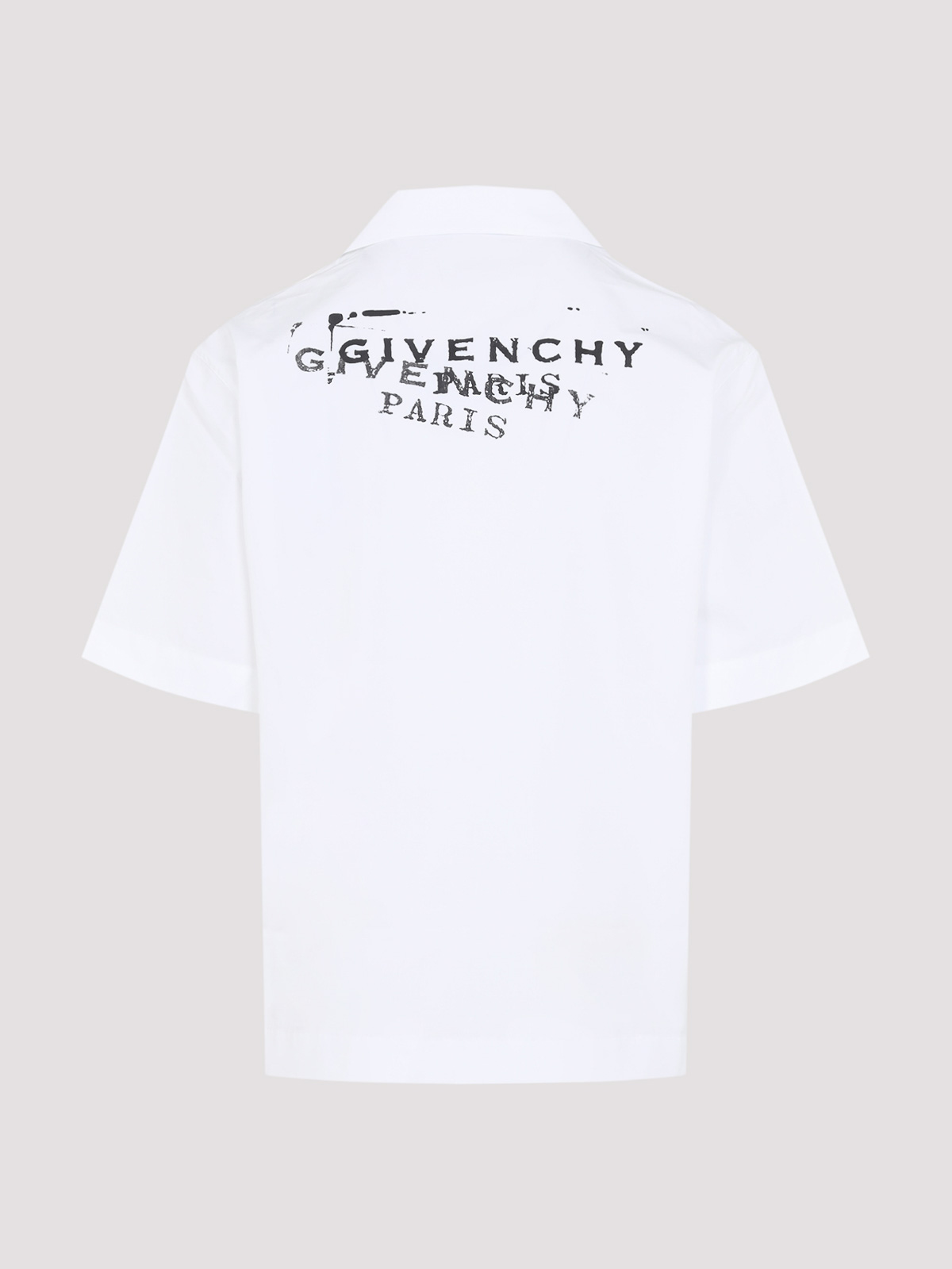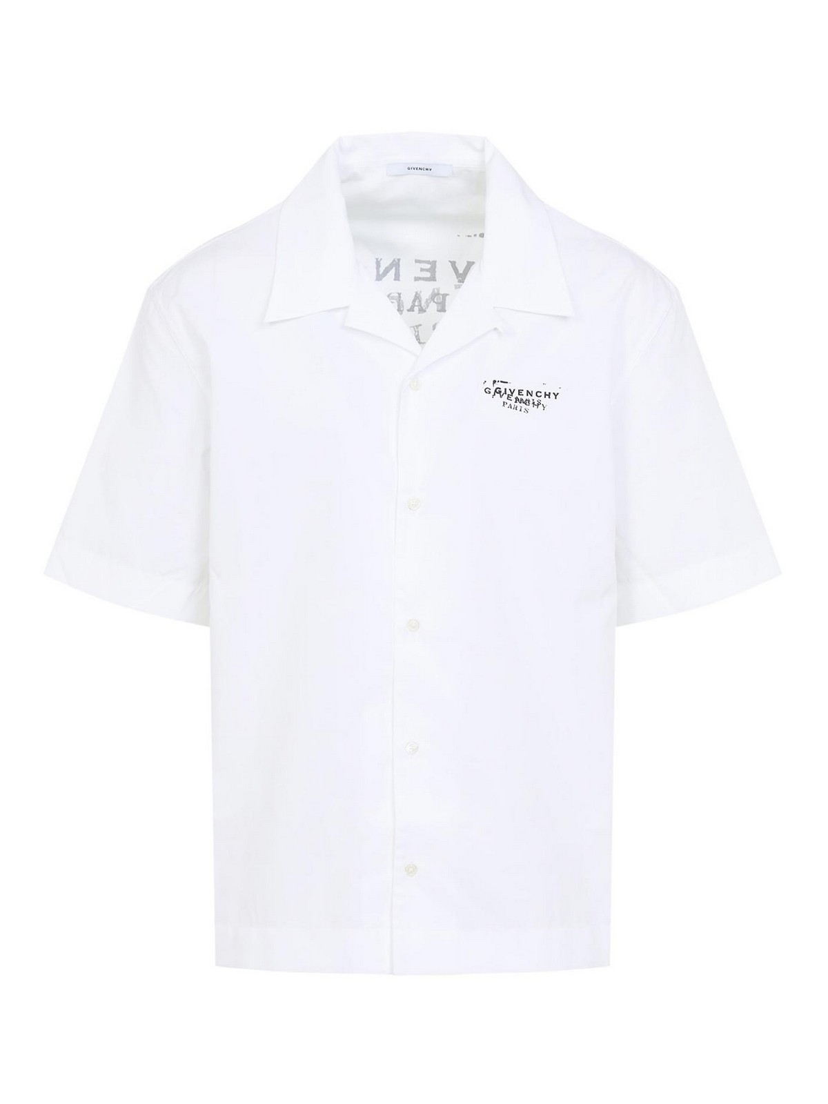 Givenchy white cotton shirt. pure white cotton shirt, bowling collar, front buttoned fastening, chest contrasting black lettering logo, back contrasting black lettering logo, short sleeves, straight hem, tonal stitching.
