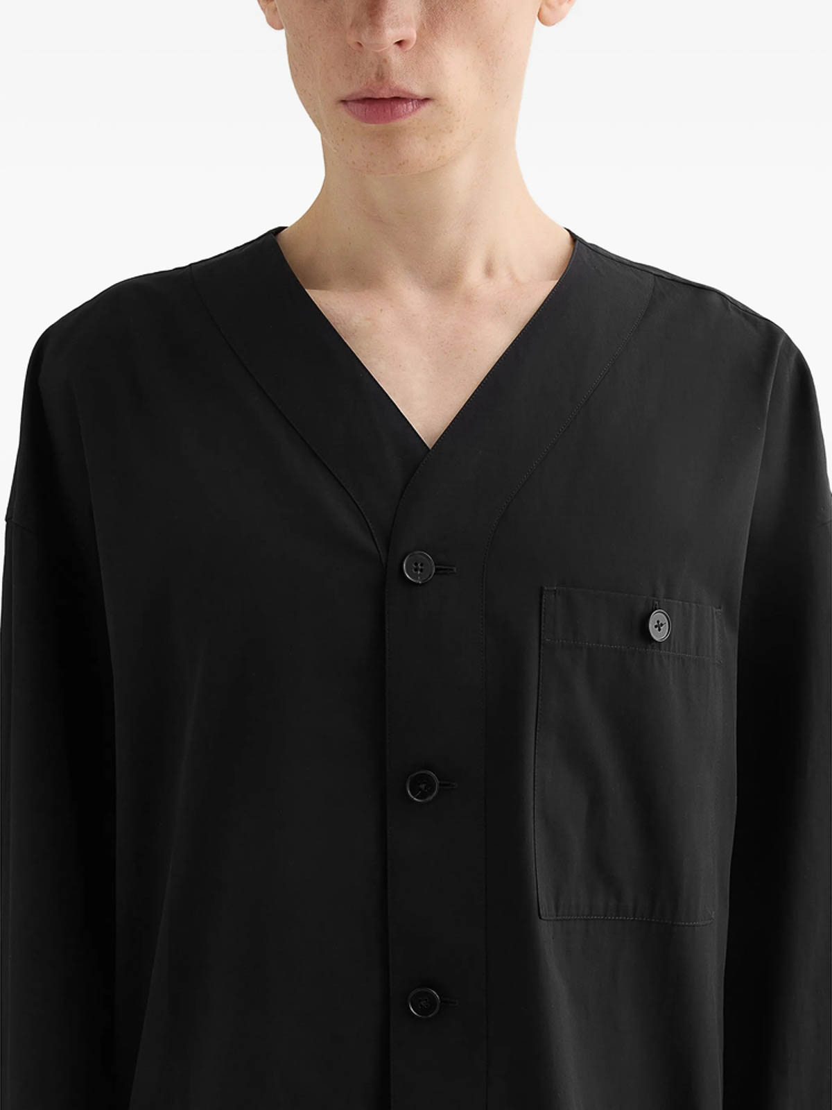 Black v-neck front button closure cotton chest patch pocket