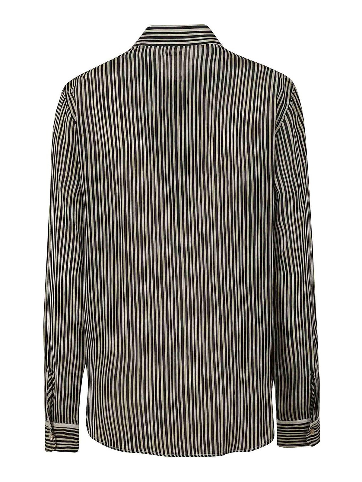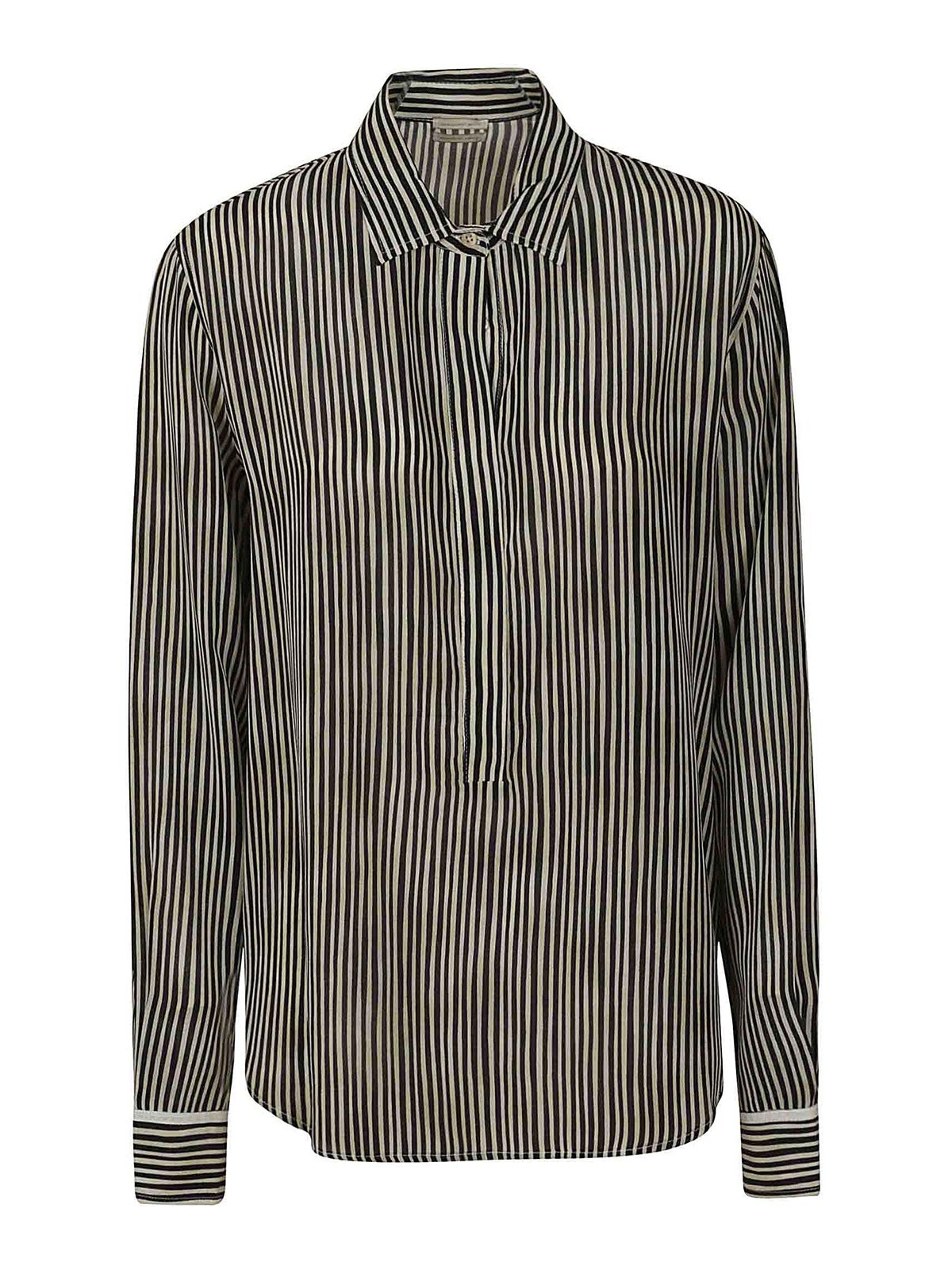 Patterned crepe de chine shirt, pointed collar, polo fastening with hidden mother-of-pearl buttons, long with cuff and button, rounded hem