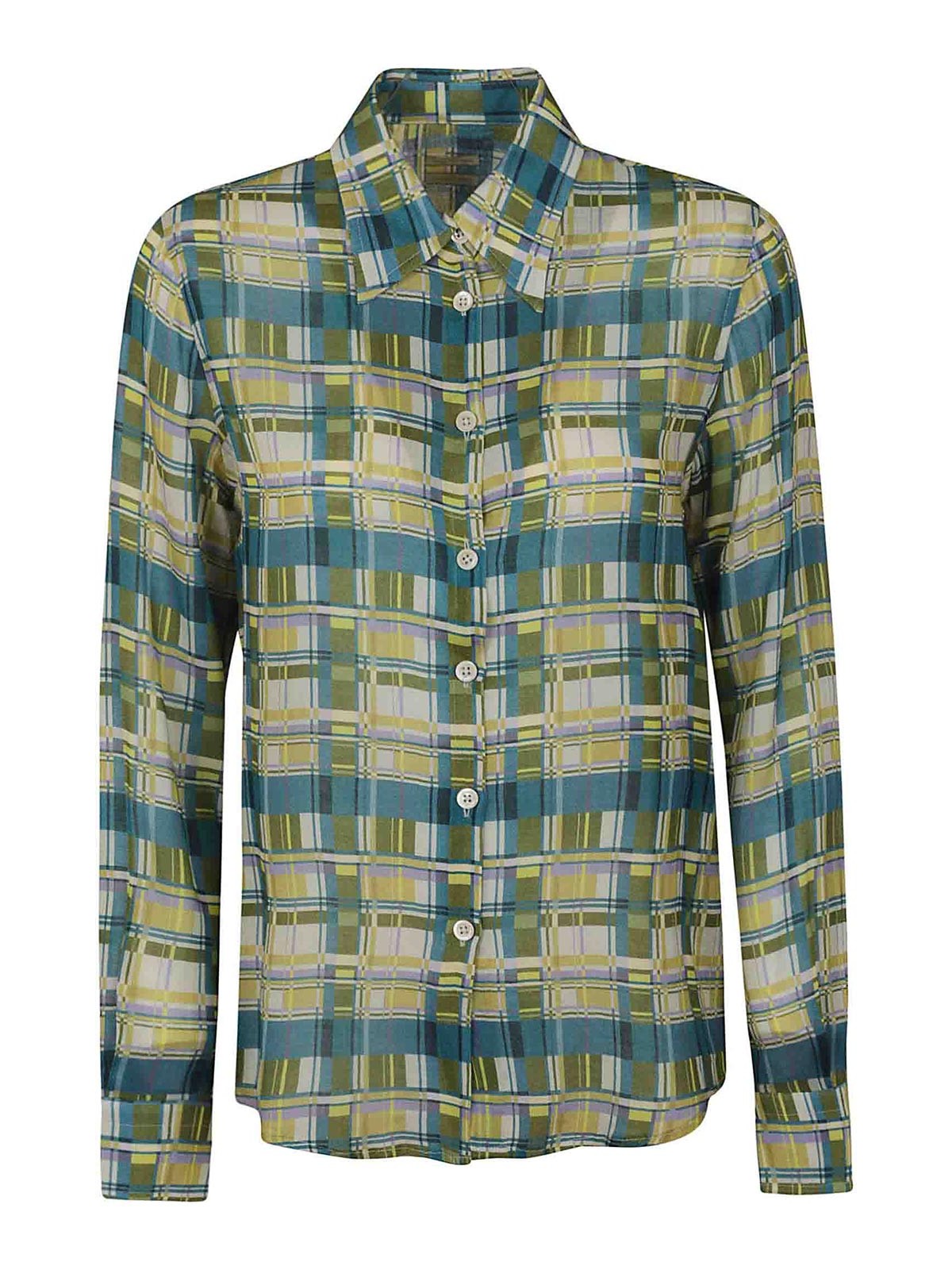 Mixed gauze shirt, pointed collar, fastening with mother-of-pearl buttons, long with cuff and buttons, rounded hem, back