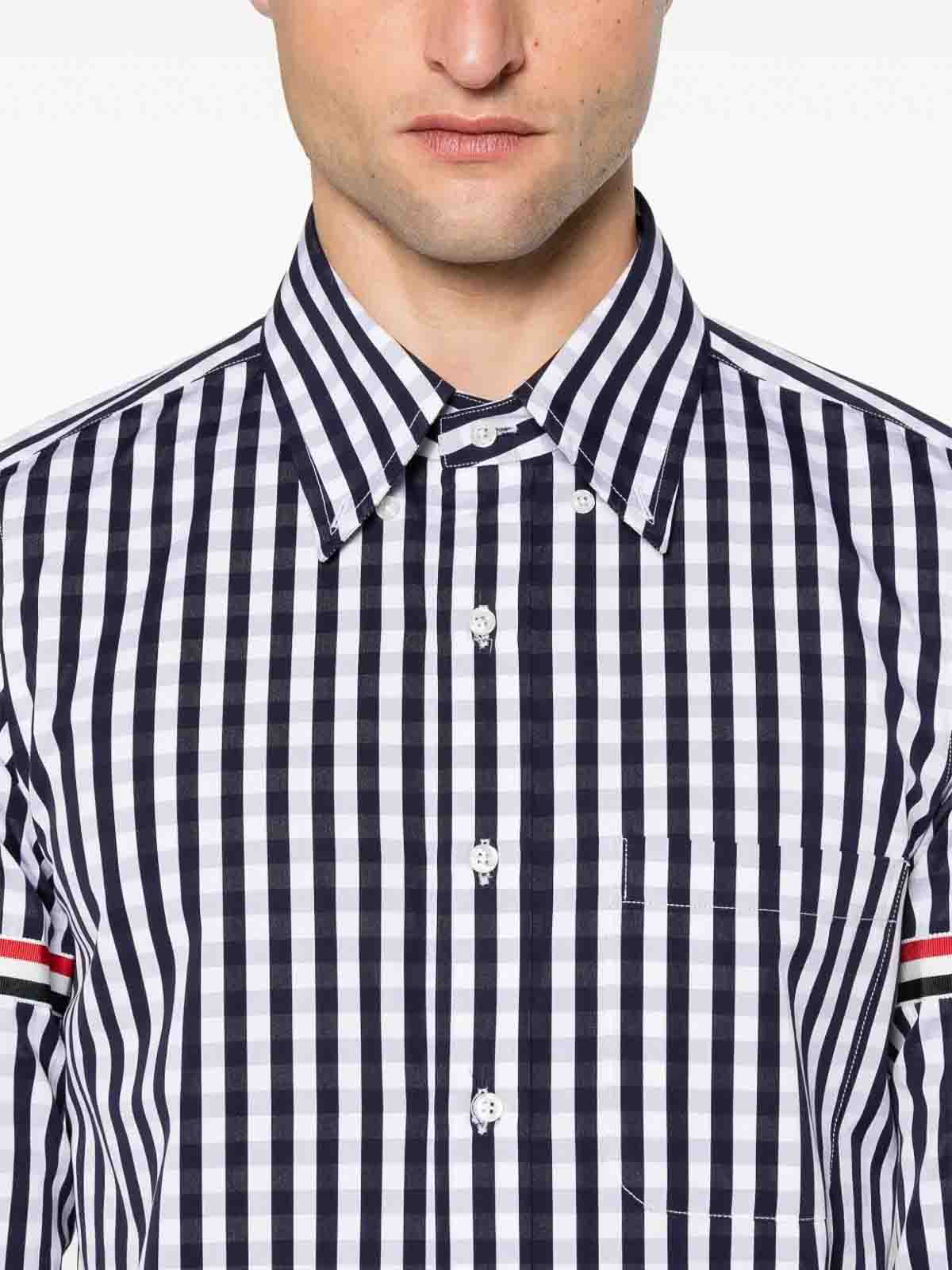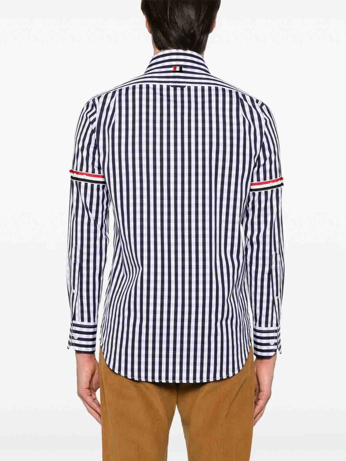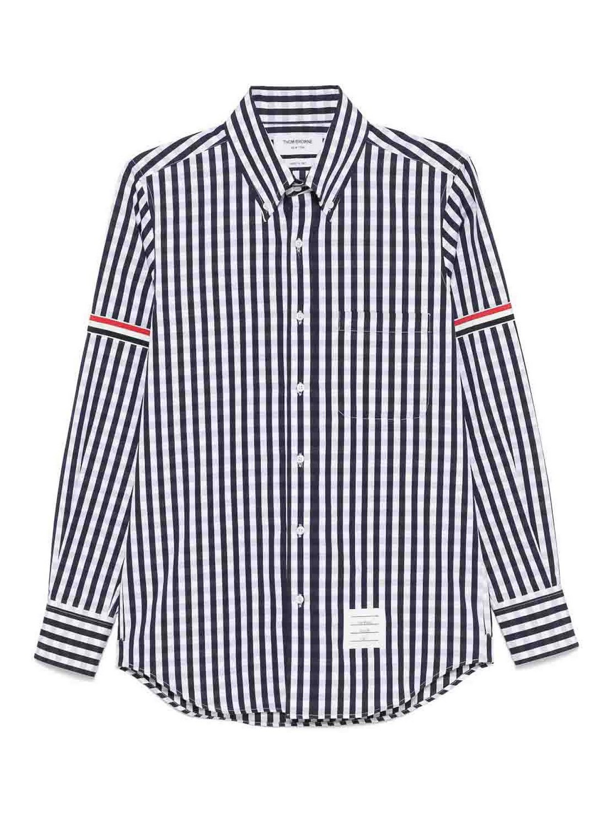 Navy blue, front button fastening, chest patch pocket, buttoned-cuff sleeves, curved hem