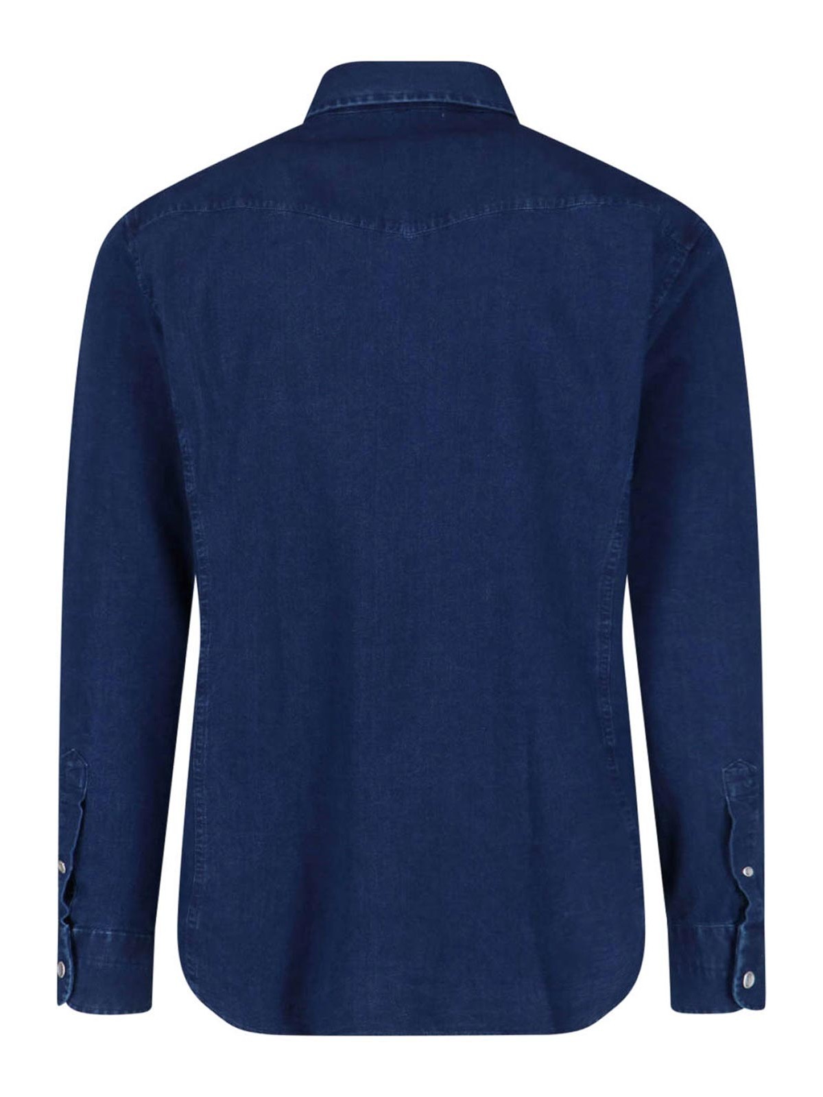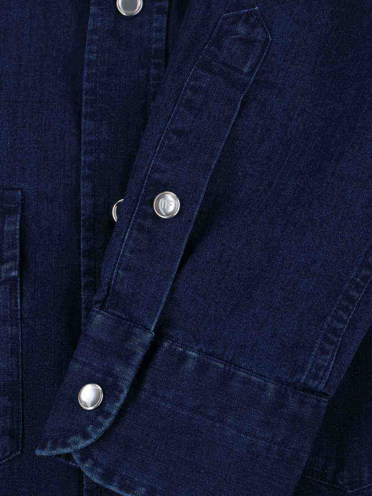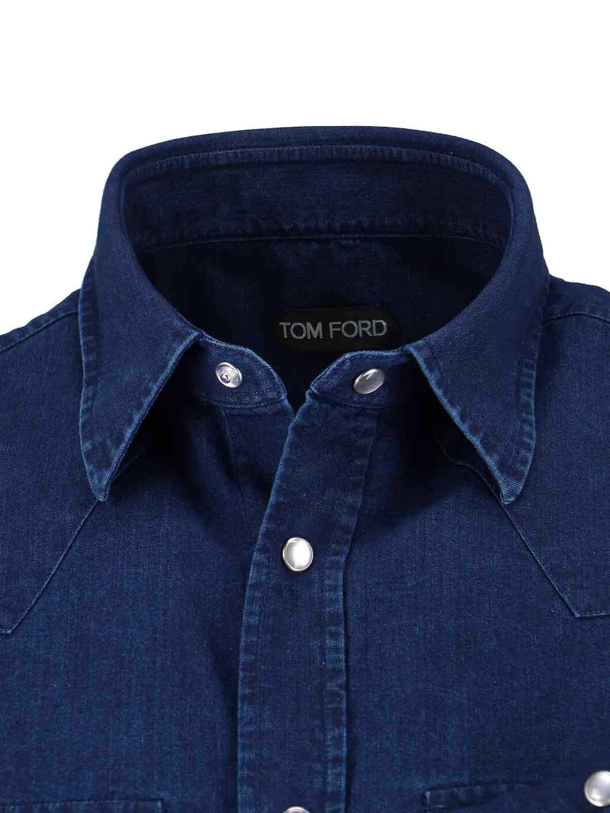 Tom Ford western shirt, in blue cotton denim, dark tone, classic collar, front button closure, long sleeves, two front button flap pockets, button cuffs. curved hem.