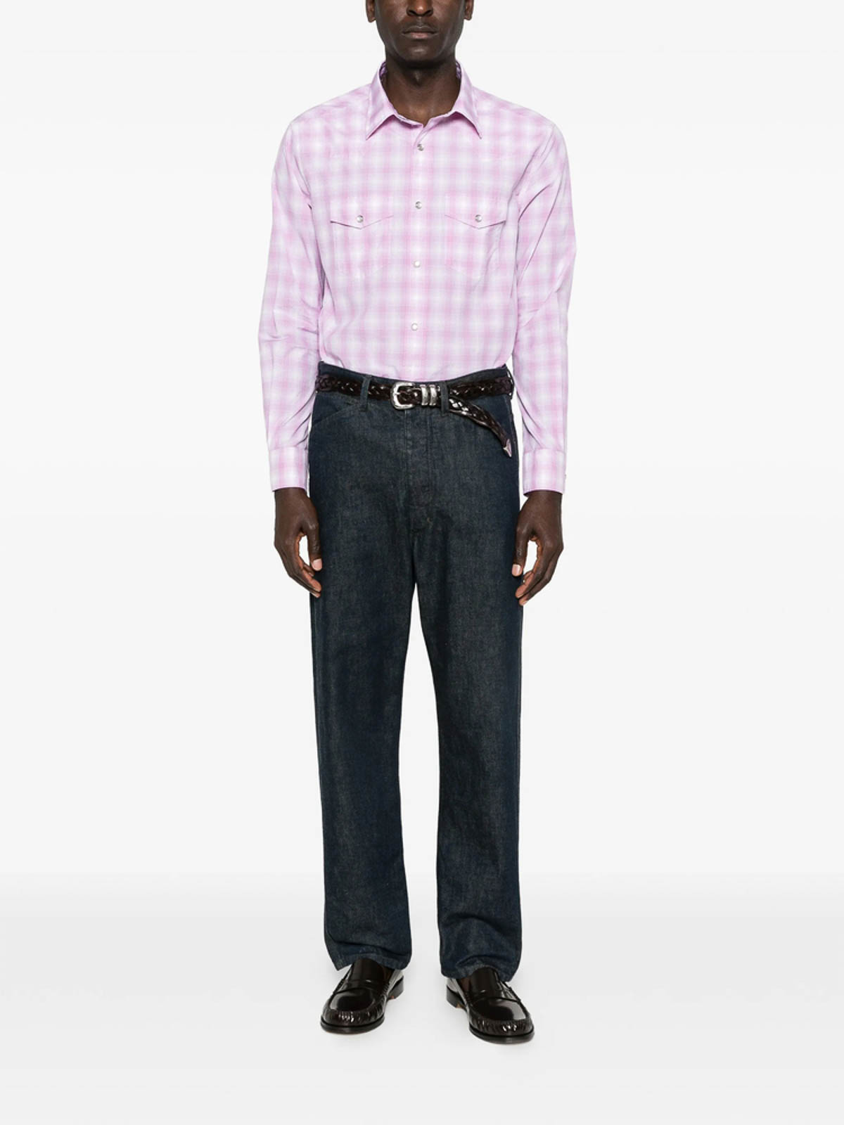 White and pink check pattern chest pockets button fastening long sleeves curved hem