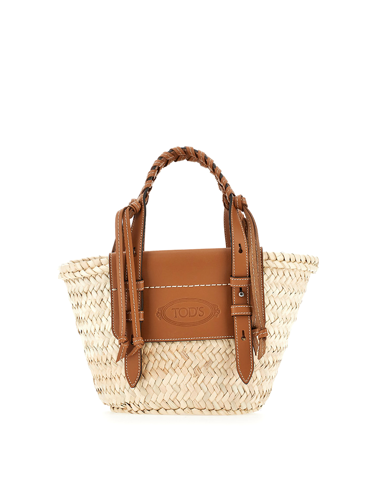 shopping bag with embossed tod's logo and adjustable handles, enriched with refined threading. basket made of 100% palm leaves from a particular species called dwarf palm, common in morocco.