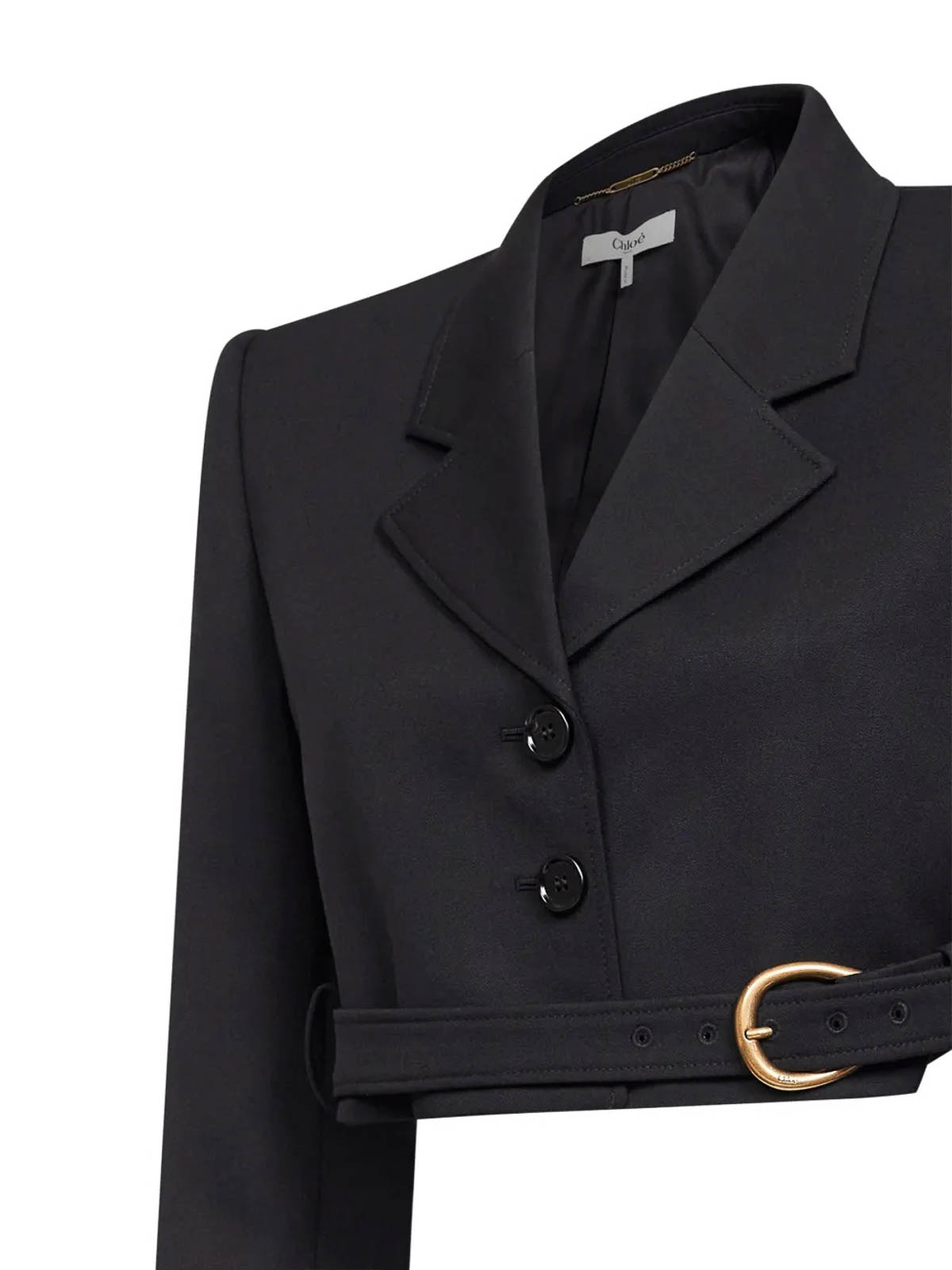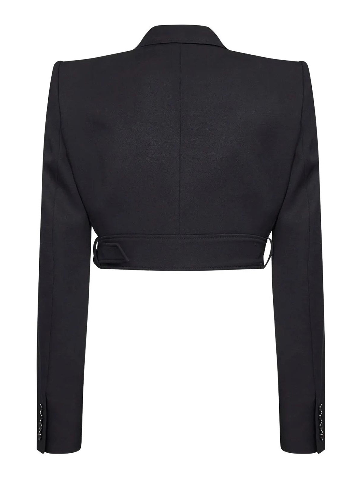 designer color: black, black, structured shoulders, gold-tone buckle, button cuffs, cropped