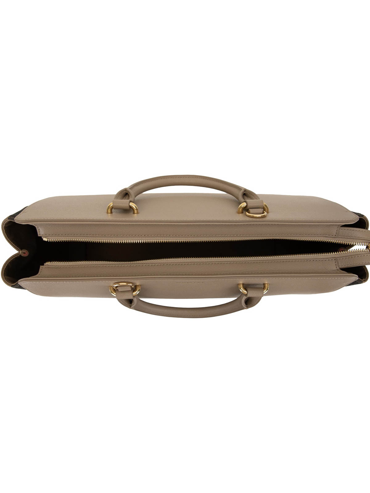 Burberry women's shoulder bag. Outdoor made of leather with fabric sides, the latter characterized by the brand's iconic paintings of the brand. Large internal space lined in fabric, has a side bag pocket with logged patch made in leather. lateral handles made of leather. Presta bags bag on the bottom, made of gold metal. adjustable and removable leather shoulder strap. zip closure. Width: 37cm Height: 27cm Depthit: 16.5cm